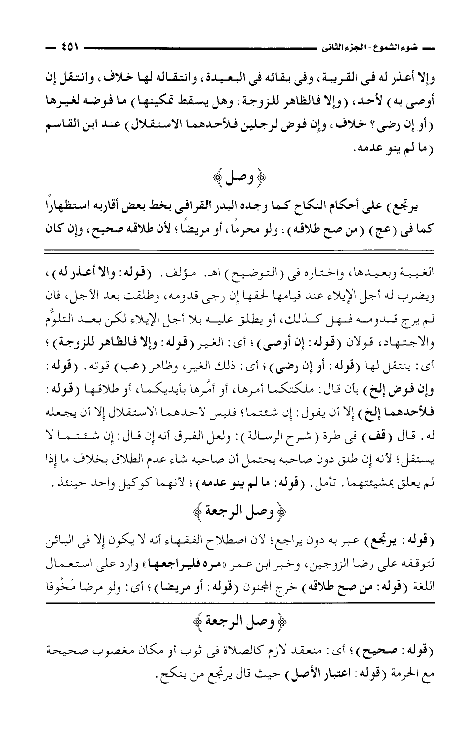 الغيبة وبعيدها، واختاره في (التوضيح) اهـ. مؤلف. (قوله: والا أعذر له)، ويضرب له أجل الإيلاء عند قيامها لحقها إن رجى قدومه، وطلقت بعد الأجل، فإن لم يرج قدومه فهل كذلك، أو يطلق عليه بلا أجل الإيلاء لكن بعد التلوُّم والاجتهاد، قولان (قوله: إن أوصى)؛ أي: الغير (قوله: وإلا فالظاهر للزوجة)؛ أي: ينتقل لها (قوله: أو إن رضي)؛ أي: ذلك الغير، وظاهر (عب) قوته. (قوله: وإن فوض إلخ) بأن قال: ملكتكما أمرها، أو أمرها بأيديكما، أو طلاقها (قوله: فلأحدهما إلخ) إلا أن يقول: إن شئتما؛ فليس لأحدهما الاستقلال لا أن يجعله له قال (قف) في طرة (شرح الرسالة): ولعل الفرق أنه إن قال: إن شئتما لا يستقل؛ لأنه إن طلق دون صاحبه يحتمل أن صاحبه شاء عدم الطلاق بخلاف ما إذا لم يعلق بمشيئتهما. تأمل (قوله: ما لم ينو عدمه)؛ لأنهما كوكيل واحد حينئذ.