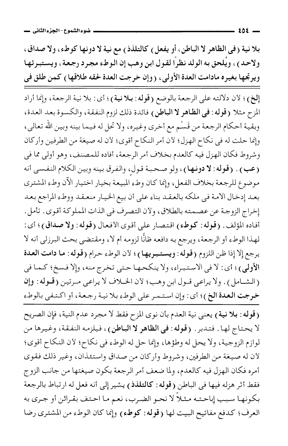 بلا نية (في الظاهر لا الباطن، أو يفعل) كالتلذذ) مع نية لا دونها كوطء، ولا صداق، ولا حد)، ويلحق به الولد نظراً لقول ابن وهب إن الوطء مجرد رجعة، ويستبرئها ويرتجها بغيره مادامت العدة الأولى، (وإن خرجت العدة لحقه طلاقها) كمن طلق في