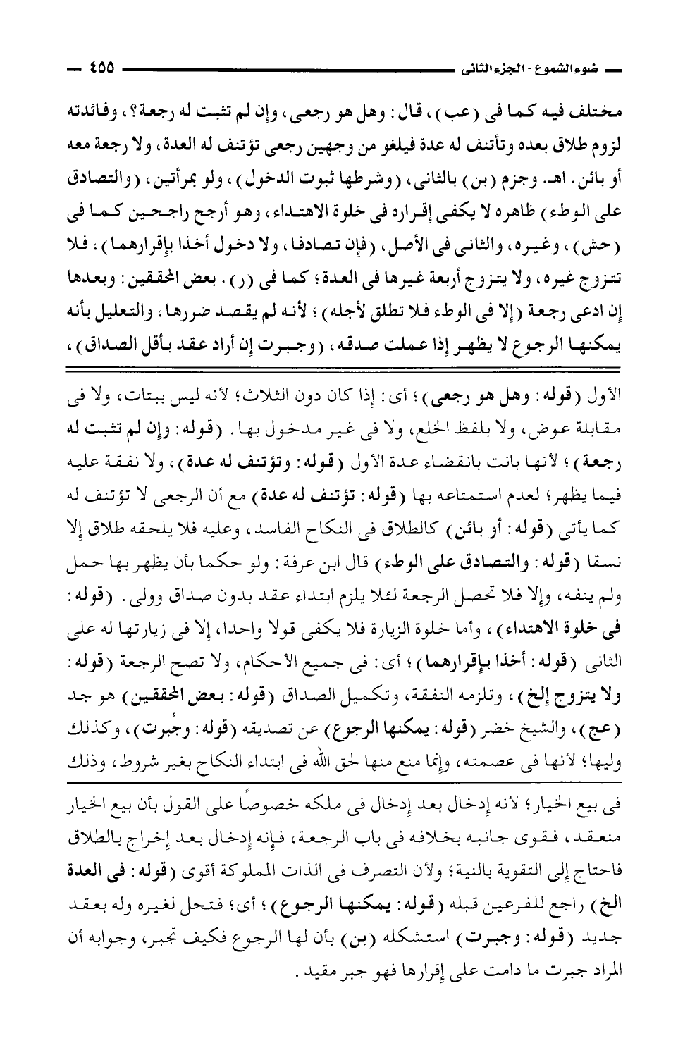 في بيع الخيار؛ لأنه إدخال بعد إدخال في ملكه خصوصا على القول بأن بيع الخيار منعقد، فقوى جانبه بخلافه في باب الرجعة، فإنه إدخال بعد إخراج بالطلاق فاحتاج إلى التقوية بالنية؛ ولأن التصرف في الذات المملوكة أقوى (قوله: في العدة الخ) راجع للفرعين قبله (قوله: يمكنها الرجوع)؛ أي؛ فتحل لغيره وله بعقد جديد (قوله: وجبرت) استشكله (بن) بأنه لها الرجوع فكيف تجبر، وجوابه أن المراد جبرت ما دامت على إقرارها فهو جبر مقيد.