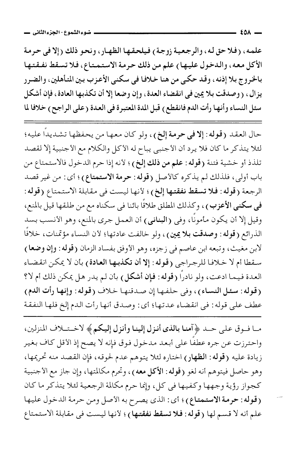 ما فوق على حد (آمنا بالذي أنزل إلينا وأنزل إليكم) لاختلاف المنزلين، واحترزت عن جره عطفًا على أبعد مدخول فوق فإنه لا يصح إذ الأقل كاف بغير زيادة عليه (قوله: الظهار) اختاره لئلا يتوهم عدم لحوقه، فإن القصد منه تحريمها، وهو حاصل فيتوهم أنه لغو (قوله: الأكل معه)، وتحرم مكالمتها، وإن جاز مع الأجنبية كجواز رؤية وجهها وكفيها في كل، وإنما حرم مكالمة الرجعية لئلا يتذكر ما كان (قوله: حرمة الاستمتاع)؛ أي: الذي يصرح به الأصل ومن حرمة الدخول عليها علم أنه لا قسم لها (قوله: لا تسقط نفقتها)؛ لأنها ليست في مقابلة الاستمتاع