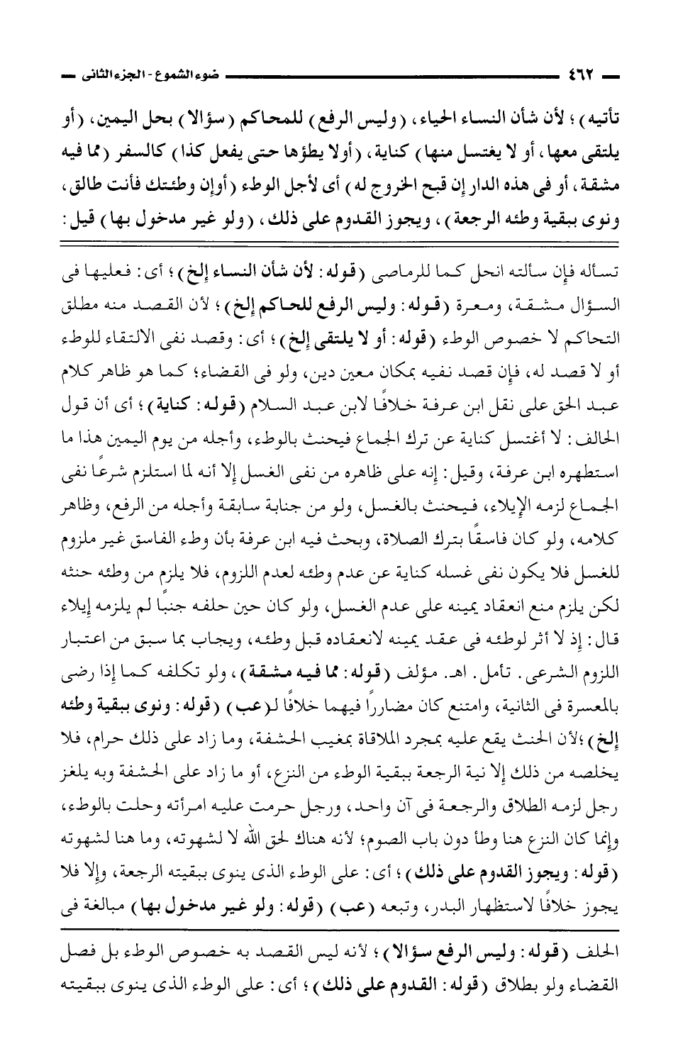 تسأله فإن سألته انحل كما للرماصى (قوله: لأن شأن النساء إلخ)؛ أي: فعليها في السؤال مشقة، ومعرة (قوله: وليس الرفع للحاكم إلخ)؛ لأن القصد منه مطلق التحاكم لا خصوص الوطء (قوله: أو لا يلتقى إلخ)؛ أي: وقصد نفى الالتقاء للوطء أو لا قصد له، فإن قصد نفيه بمكان معين دين، ولو في القضاء؛ كما هو ظاهر كلام عبد الحق على نقل ابن عرفة خلافًا لابن عبد السلام (قوله: كناية)؛ أي أن قول الحالف: لا أغتسل كناية عن ترك الجماع فيحنث بالوطء، وأجله من يوم اليمين هذا ما استطهره ابن عرفة، وقيل: إنه على ظاهره من نفى الغسل إلا أنه لما استلزم شرعًا نفى الجماع لزمه الإيلاء، فيحنث بالغسل، ولو من جنابة سابقة وأجله من الرفع، وظاهر كلامه، ولو كان فاسقًا بترك الصلاة، وبحث فيه ابن عرفة بأن وطء الفاسق غير ملزوم للغسل فلا يكون نفي غسله كناية عن عدم وطئه لعدم اللزوم، فلا يلزم من وطئه حنثه لكن يلزم منع انعقاد يمينه على عدم الغسل، ولو كان حين حلفه جنبًا لم يلزمه إيلاء قال: إذ لا أثر لوطئه في عقد يمينه لانعقاده قبل وطئه، ويجاب بما سبق من اعتبار اللزوم الشرعي: تأمل. اهـ. مؤلف (قوله: مما فيه مشقة)، ولو تكلفه كما إذا رضى بالمعسرة في الثانية، وامتنع كان مضاررًا فيهما خلافًا لـ (عب) (قوله: ونوى ببقية وطئه إلخ)؛ لأن الحنث يقع عليه بمجرد الملاقاة بمغيب الحشفة، وما زاد على ذلك حرام، فلا يخلصه من ذلك إلا نية الرجعة ببقية الوطء من النزع، أو ما زاد على الحشفة وبه يلغز رجل لزمه الطلاق والرجعة في آن واحد، ورجل حرمت عليه امرأته وحلت بالوطء، وإنما كان النزع هنا وطأ دون باب الصوم؛ لأنه هناك لحق الله لا لشهوته، وما هنا لشهوته (قوله: ويجوز القدوم على ذلك)؛ أي: على الوطء الذي ينوى ببقيته الرجعة، وإلا فلا يجوز خلافًا لاستظهار البدر، وتبعه (عب) (قوله: ولو غير مدخول بها) مبالغة في