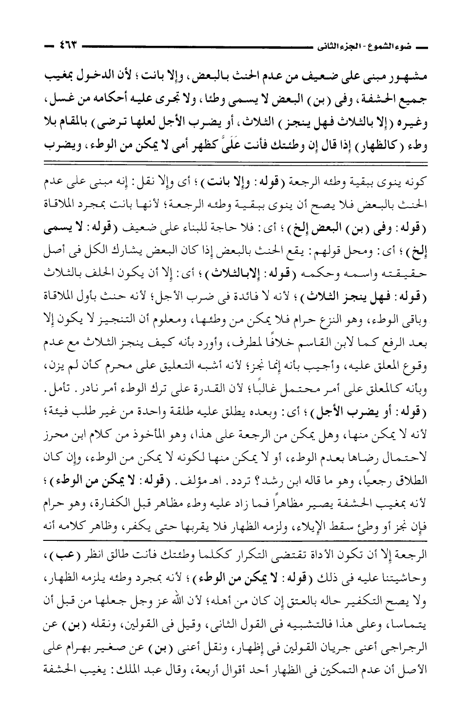 كونه ينوى ببقية وطئه الرجعة (قوله: وإلا بانت)؛ أي وإلا نقل: إنه مبنى على عدم الحنث بالبعض فلا يصح أن ينوى ببقية وطئه الرجعة؛ لأنها بانت بمجرد الملاقاة (قوله: وفي (بن) البعض إلخ)؛ أي: فلا حاجة للبناء على ضعيف (قوله: لا يسمى إلخ)؛ أي: ومحل قولهم: يقع الحنث بالبغض إذا كان البعض يشارك الكل في أصل حقيقته واسمه وحكمه (قوله: إلا بالثلاث)؛ أي: إلا أن يكون الحلف بالثلاث (قوله: فهل ينجز الثلاث)؛ لأنه لا فائدة في ضرب الأجل؛ لأنه حنث بأول الملاقاة وباقي الوطء، وهو النزع حرام فلا يمكن من وطئها، ومعلوم أن التنجيز لا يكون إلا بعد الرفع كما لابن القاسم خلافًا لمطرف، وأورد بأنه كيف ينجز الثلاث مع عدم وقوع المعلق عليه، وأجيب بأنه إنما نجز؛ لأنه أشبه التعليق على محرم كأن لم يزن وبأنه كالمعلق على أمر محتمل غالبًا؛ لأن القدرة على ترك الوطء أمر نادر. تأمل. (قوله: أو يضرب الأجل)؛ أي: وبعده يطلق عليه طلقة واحدة من غير طلب فيئة؛ لأنه لا يمكن منها، وهل يمكن من الرجعة على هذا، وهو المأخوذ من كلام ابن محرز لاحتمال رضاها بعدم الوطء، أو لا يمكن منها لكونه لا يمكن من الوطء، وإن كان الطلاق رجعياً، وهو ما قاله ابن رشد. تردد. اهـ مؤلف. (قوله: لا يمكن من الوطء)؛ لأنه بمغيب الحشفة يصير مظاهرًا فما زاد عيه وطء مظاهر قبل الكفارة، وهو حرام فإن نجز أو وطئ سقط الإيلاء، ولزمه الظهار فلا يقربها حتى يكفر، وظاهر كلامه أنه