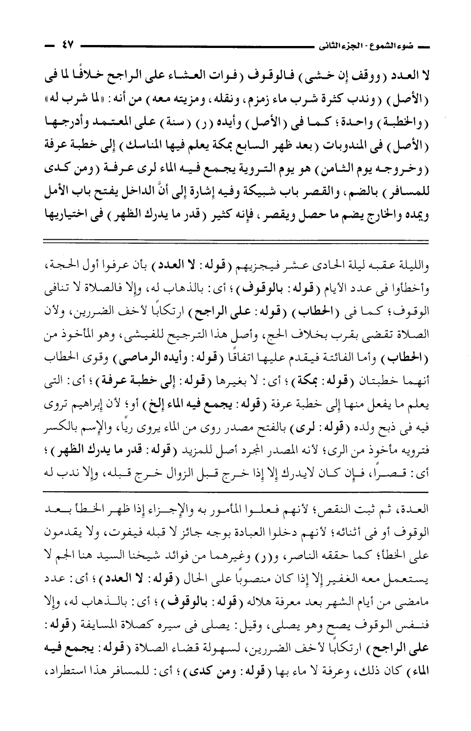 العدة، ثم ثبت النقص؛ لأنهم فعلوا المأمور به والإجزاء إذا ظهر الخطأ بعد الوقوف أو فى أثنائه؛ لأنهم دخلوا العبادة بوجه جائز لا قبله فيفوت، ولا يقدمون على الخطأ؛ كما حققه الناصر، و (ر) وغيرهما من فوائد شيخنا السيد هنا الجم لا يستعمل معه الغفير إلا إذا كان منصوبًا على الحال (قوله: لا العدد)؛ أى: عدد ما مضى من أيام الشهر بعد معرفة هلاله (قوله: بالوقوف)؛ أى: بالذهاب له؛ وإلا فنفس الوقوف يصح وهو يصلى، وقيل: يصلى فى سيره كصلاة المسايفة (قوله: على الراجح) ارتكابًا لأخف الضررين، لسهولة قضاء الصلاة (قوله: يجمع فيه الماء) كان ذلك، وعرفة لا ماء بها (قوله: ومن كدى)؛ أى: للمسافر هذا استطراد،