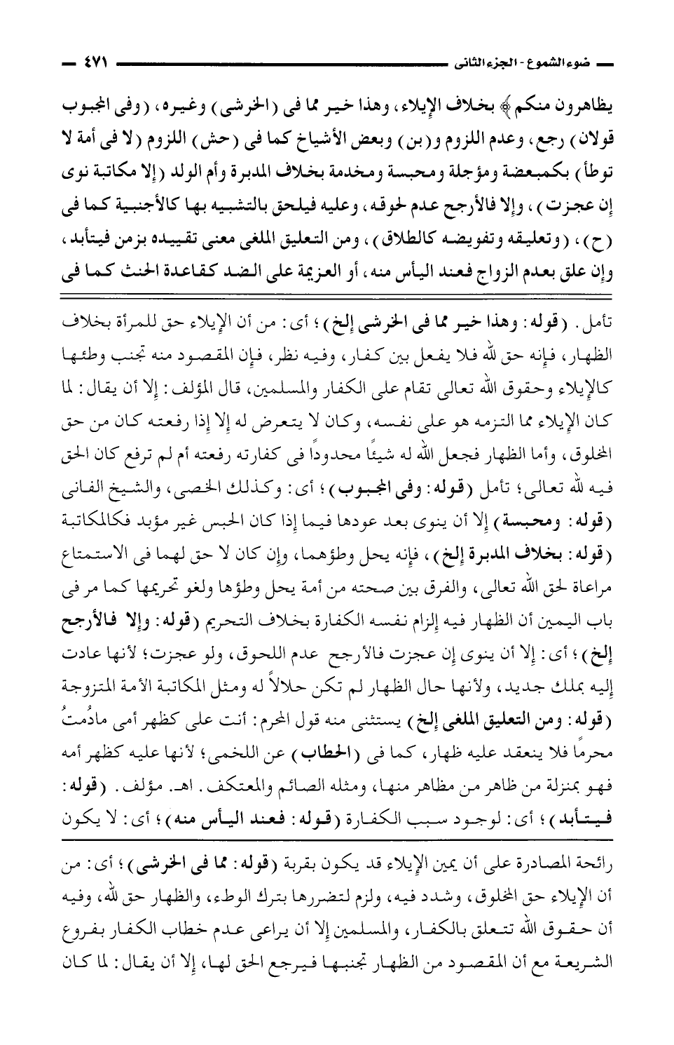 تأمل. (قوله: وهذا خير مما في الخرشى إلخ)؛ أي: من أن الإيلاء حق للمرأة بخلاف الظهار، فإنه حق لله فلا يفعل بين كفار، وفيه نظر، فإن المقصود منه تجنب وطئها كالإيلاء وحقوق الله تعالى تقام على الكفار والمسلمين، قال المؤلف: إلا أن يقال: لما كان الإيلاء مما التزمه هو على نفسه، وكان لا يتعرض له إلا إذا رفعته كان من حق المخلوق، وأما الظهار فجعل الله له شيئاً محدودًا في كفارته رفعته أم لم ترفع كان الحق فيه لله تعالى؛ تأمل (قوله: وفي المجبوب)؛ أي: وكذلك الخصى، والشيخ الفاني (قوله: ومحبسة) إلا أن ينوى بعد عودها فيما إذا كان الحبس غير مؤيد فكالمكاتبة (قوله: بخلاف المدبر إلخ)، فإنه يحل وطؤهما، وإن كان لاحق لهما في الاستمتاع مراعاة لحق الله تعالى، والفرق بين صحته من أمة يحل وطؤها ولغو تحريمها كما مر في باب اليمين أن الظهار فيه إلزام نفسه الكفارة بخلاف التحريم (قوله: وإلا فالأرجح إلخ)؛ أي: إلا أن ينوى إن عجزت فالأرجح عدم اللحوق، ولو عجزت؛ لأنها عادت إليه بملك جديد، ولأنها حال الظهار لم تكن حلالاً له ومثل المكاتبة الأمة المتزوجة (قوله: ومن التعليق الملغي إلخ) يستثنى منه قول المحرم: أنت على كظهر أمي مادمت محرمًا فلا ينعقد عليه ظهار، كما في (الحطاب) عن اللخمى؛ لأنها عليه كظهر أمه فهو بمنزلة من ظاهر من مظاهر منها، ومثله الصائم والمعتكف. اهـ. مؤلف. (قوله: فيتأبد)؛ أي: لوجود سبب الكفارة (قوله: فعند اليأس منه)؛ أي: لا يكون رائحة المصادرة على أن يمين الإيلاء قد يكون بقربة (قوله: مما في الخرشى)؛ أي: من الإيلاء حق المخلوق، وشدد فيه، ولزم لتضررها بترك الوطء، والظهار حق لله، وفيه أن حقوق الله تتعلق بالكفار، والمسلمين إلا أن يراعى عدم خطاب الكفار بفروع الشريعة مع أن المقصود من الظهار تجنبها فيرجع الحق لها، إلا أن يقال: لما كان