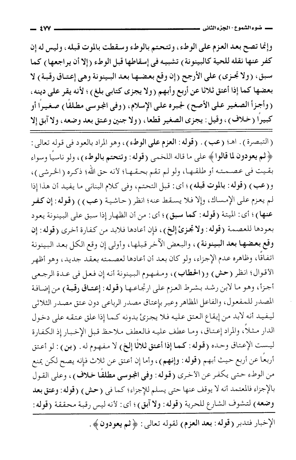 (التبصرة) , اهـ (عب). (قوله: العزم على الوطء)، وهو المراد بالعود في قوله تعالى: (ثم يعودون لما قالوا) على ما قاله اللخمى (قوله: وتتحتم بالوطء)، ولو ناسيًا وسواء بقيت في عصمته أو طلقها، ولو لم تقم بحقها؛ لأنه حق الله؛ ذكره (الخرشى)، و (عب) (قوله: بالموت قبله)؛ أي: قبل التحتم، وفي كلام البناني ما يفيد أن هذا إذا لم يعزم على الإمساك، وإلا فلا يسقط عنه؛ انظر (حاشية (عب)) (قوله: إن كفر عنها)؛ أي: الميتة (قوله: كما سبق)؛ أي: من أن الظهار إذا سبق على البينونة يعود بعودها للعصمة (قوله: ولا تجزئ إلخ)، فإن أعادها فلا بد من كفارة أخرى (قوله: إن وقع بعضها بعد البينونة)، والبعض الآخر قبلها، وأولى إن وقع الكل بعد البينونة اتفاقاً، وظاهره عدم الإجزاء، ولو كان بعد أن أعادها لعصمته بعقد جديد، وهو أظهر الأقوال؛ انظر (حش) و (الحطاب)، ومفهوم البينونة أنه إن فعل في عدة الرجعى أجزأ، وهو ما لابن رشد بشرط العزم على ارتجاعها (قوله: إعتاق رقبة) من إضافة المصدر للمفعول، والفاعل المظاهر وعبر بإعتاق مصدر الرباعي دون عتق مصدر الثلاثي ليفيد أنه لابد من إيقاع العتق عليه فلا يجزئ بدونه كما إذا علق عتقه على دخول الدار مثلاً، والمراد إعتاق، وما عطف عليه فالعطف ملاحظ قبل الإخبار إذ الكفارة ليست الإعتاق وحدة (قوله: كما إذا أعتق ثلاثًا إلخ) لا مفهوم له. (بن): لو أعتق أربعًا عن أربع حيث أبهم (قوله: وإنهم)، وأما إن أعتق عن ثلاث فإنه يصح لكن يمنع من الوطء حتى يكفر عن الأخرى (قوله: وفي المجوس مطلقًا خلاف)، وعلى القول بالإجزاء فالمعتمد أنه لا يوقف عنها حتى يسلم للإجزاء؛ كما في (حش) (قوله: وعتق بعد وضعه) لتشوق الشارع للحرية (قوله: ولا آبق)؛ أي: لأنه ليس رقبة محققة (قوله: