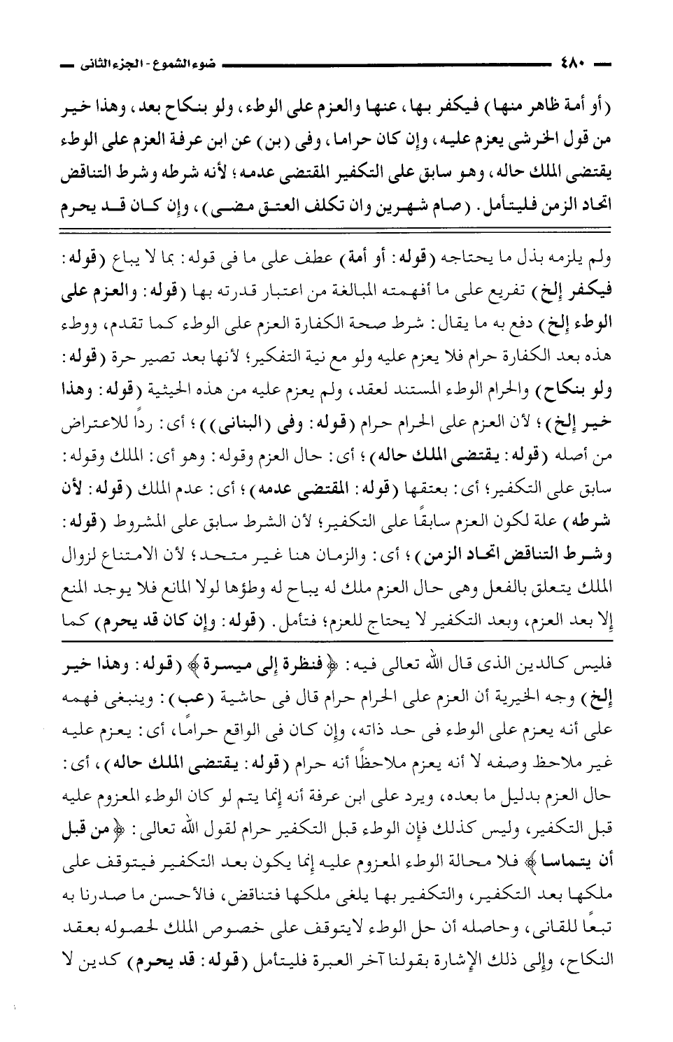 فليس كالدين الذي قال الله تعالى فيه: (فنظرة إلى ميسرة) (قوله: وهذا خير إلخ) وجه الخيرية أن العزم على الحرام حرام قال في حاشية (عب): وينبغي فهمه على أنه يعزم على الوطء في حد ذاته، وإن كان في الواقع حرامًا، إي: يعزم عليه غير ملاحظ وصفه لا أنه يعزم ملاحظًا أنه حرام (قوله: يقتضى الملك حاله)، أي: حال العزم بدليل ما بعده، ويرد على ابن عرفة أنه إنما يتم لو كان الوطء المعزوم عليه قبل التكفير، وليس كذلك فإن الوطء التكفير حرام لقول الله تعالى: (من قبل أن يتماسا) فلا محالة الوطء المعزوم عليه إنما يكون بعد التكفير فيتوقف على ملكها بعد التكفير، والتكفير بها يلغى ملكها فتناقض، فالأحسن ما صدرنا به تبعًا للقاني، وحاصله أن حل الوطء لا يتوقف على خصوص الملك لحصوله بعقد النكاح، وإلى ذلك الإشاة بقولنا آخر العبرة فليتأمل (قوله: قد يحرم) كدين لا