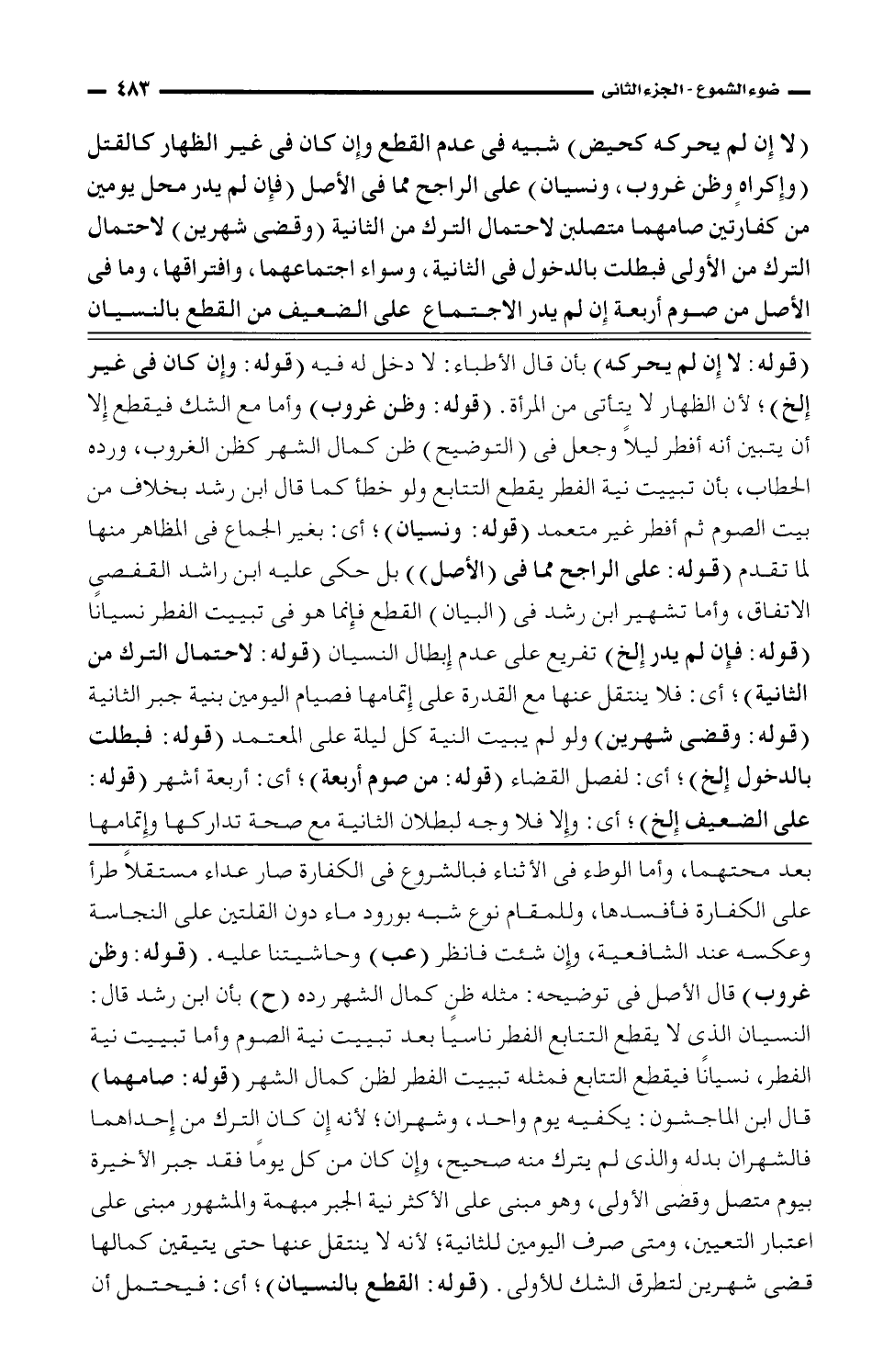 بعد محتهما، واما الوطء في الأثناء فبالشروع في الكفارة صار عداء مستقلًا طرأ على الكفارة فأفسده، وللمقام نوع شبه بورود ماء دون القلتين على النجاسة وعكسه عند الشافعية، وإن شئت فانظر (عب) وحاشيتنا عليه. (قوله: وظن غروب) قال الأصل في توضيحه: مثله ظنٍ كمال الشهر رده (ح) بأن ابن رشد قال: النسيان الذي لا يقطع لتتابع الفطر ناسيًا بعد تبييت نية الصوم وأما تبييت نية الفطر، نسيانًا فيقطع التابع فمثله تبييت الفطر لظن كمال الشهر (قوله: صامهما قال ابن الماجشون: يكفيه يوم واحد، وشهران؛ لأنه كما الشهر (قوله: صامهما) قال ابن الماجشون: يكفيه يوم واحد، وشهران؛ لأنه إن كان الترك من أحداهما فالشهران بدله والذي لم يترك منه صحيح، وإن كان من كل يوماً فقد جبر الأخيرة بيوم متصل وقضى الأولى، وهو مبنى على الأكثر نية الجبر مبهمة والمشهور مبنى على اعتبار التعيين، ومتى صرف اليومين للثانية؛ لأنه لا ينتقل عنها حتى يتيقين كمالها قضى شهرين لتطرق الشك للأولى (قوله: القطع بالنسيان)؛ أي: فيحتمل أن