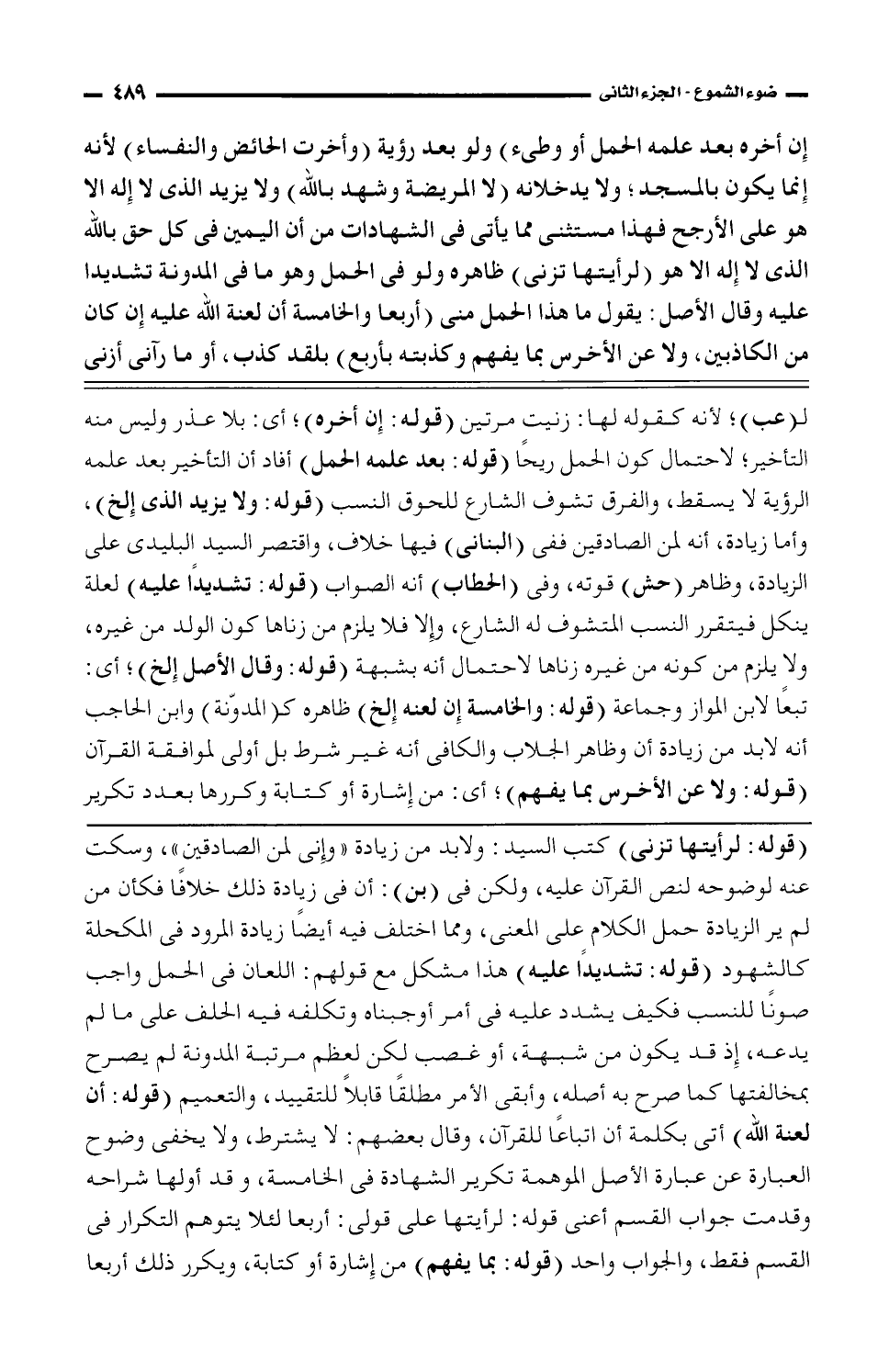لـ (عب)؛ لأنه كقوله لها: زنيت مرتين (قوله: إن أخره)؛ أي: بلا عذر وليس منه التأخير؛ لاحتمال كون الحمل ريحًا (قوله: بعد علمه الحمل) أفاد أن التأخير بعد علمه الرؤية لا يسقط، والفرق تشوف الشارع للحوق النسب (قوله: ولا يزيد الذي إلخ)، وأما زيادة، أنه لمن الصادقين ففي (البنانى) فيها خلاف، واقتصر السيد البليدى على الزيادة، وظاهر (حش) فوته، وفي (الحطاب) أنه الصواب (قوله: تشديدًا عليه) لعلة ينكل فيتقرر النسب المتشوف له الشارع، وإلا فلا يلزم من زناها كون الولد من غيره، ولا يلزم من كونه من غيره زناها لا حتمال أنه بشبهة (قوله: وقال الأصل إلخ)؛ أي: تبعًا لابن المواز وجماعة (قوله: والخامسة إن لعنه إلخ) ظاهرة كـ (المدونة) وابن الحاجب أنه لابد من زيادة أن وطاهر الجلاب والكافي أنه غير شرط بل أولى لموافقة القرآن (قوله: ولا عن الأخرس بما يفهم)؛ أي: من إشارة أو كتابة وكررها بعدد تكرير
