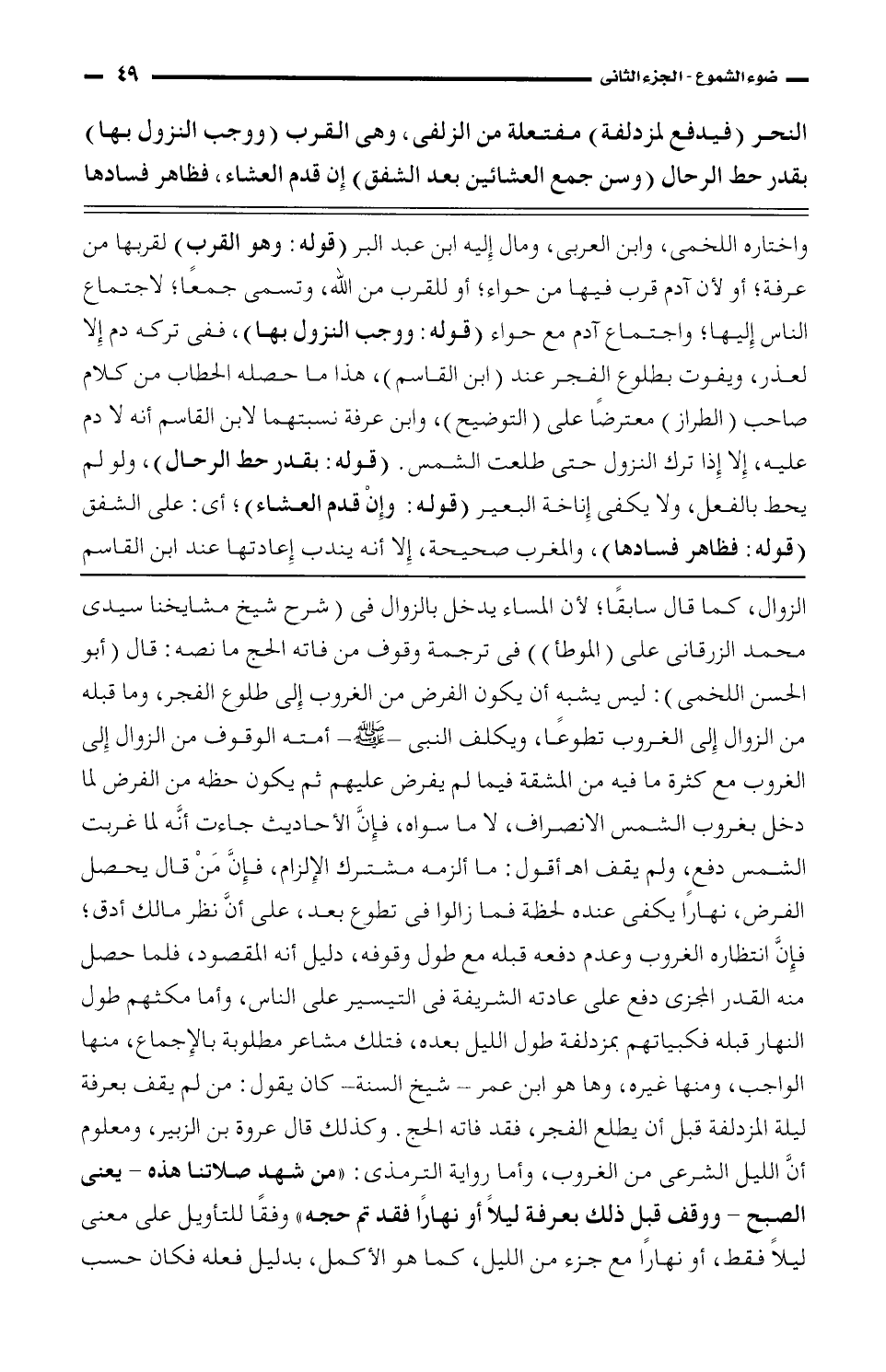 النحر (فيدفع لمزدلفة) مفتعلة من الزفلى، وهى القرب (ووجب النزول بها) بقدر حط الرحال (وسن جمع العشائين بعد الشفق) إن قدم العشاء، فظاهر فسادها