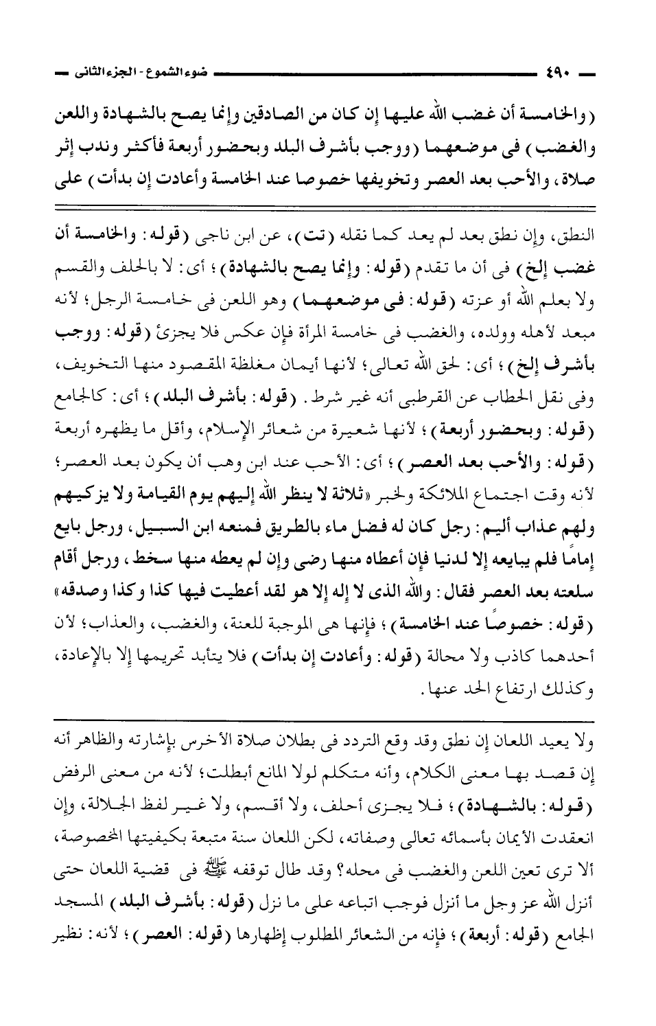 النطق، وإن نطق بعد لم يعد كما نقله (تت)، عن ابن ناجي (قوله: والخامسة أن غضب إلخ) في أن ما تقدم (قوله: وإنما يصح بالشهادة)؛ أي: لا بالحلف والقسم ولا بعلم الله أو عزته (قوله: في موضعهما) وهو اللعن في خامسة الرجل؛ لأنه مبعد لأهله وولده، والغضب في خامسة المرأة فإن عكس فلا يجزئ (قوله: ووجب بأشرف إلخ)؛ أي: لحق الله تعالى؛ لأنها أيمان مغلظة المقصود منها التخويف، وفي نقل الحطاب عن القرطبي أنه غير شرط. (قوله: بأشرف البلد)؛ أي: كالجامع (قوله: وبحضور أربعة)؛ لأنها شعيرة من شعائر الإسلام، وأقل ما يظهره أربعة (قوله: والأحب بعد العصر)؛ أي: الأحب عند ابن وهب أن يكون بعد العصر؛ لأنه وقت اجتماع الملائكة ولخبز "ثلاثة لا ينظر الله إليهم يوم القيامة ولا يزكيهم ولهم عذاب أليهم: رجل كان له فضل ماء بالطريق فمنعه ابن السبيل، ورجل بايع إمامًا فلم يبايعه إلا لدينا فإن أعطاه منها رضى وإن لم يعطيه منها سخط، ورجل أقام سلعته بعد العصر فقال: والله الذي لا إله إلا هو لقد أعطيت فيها كذا وكذا وصدقه" (قوله: خصوصًا عند الخامسة)؛ فإنها هي الموجبة للعنة، والغضب، والعذاب؛ لأن أحدهما كاذب ولا محالة (قوله: وأعادت إن بدأت) فلا يتأبد تحريمها إلا بالإعادة، وكذلك ارتفاع الحد عنها.