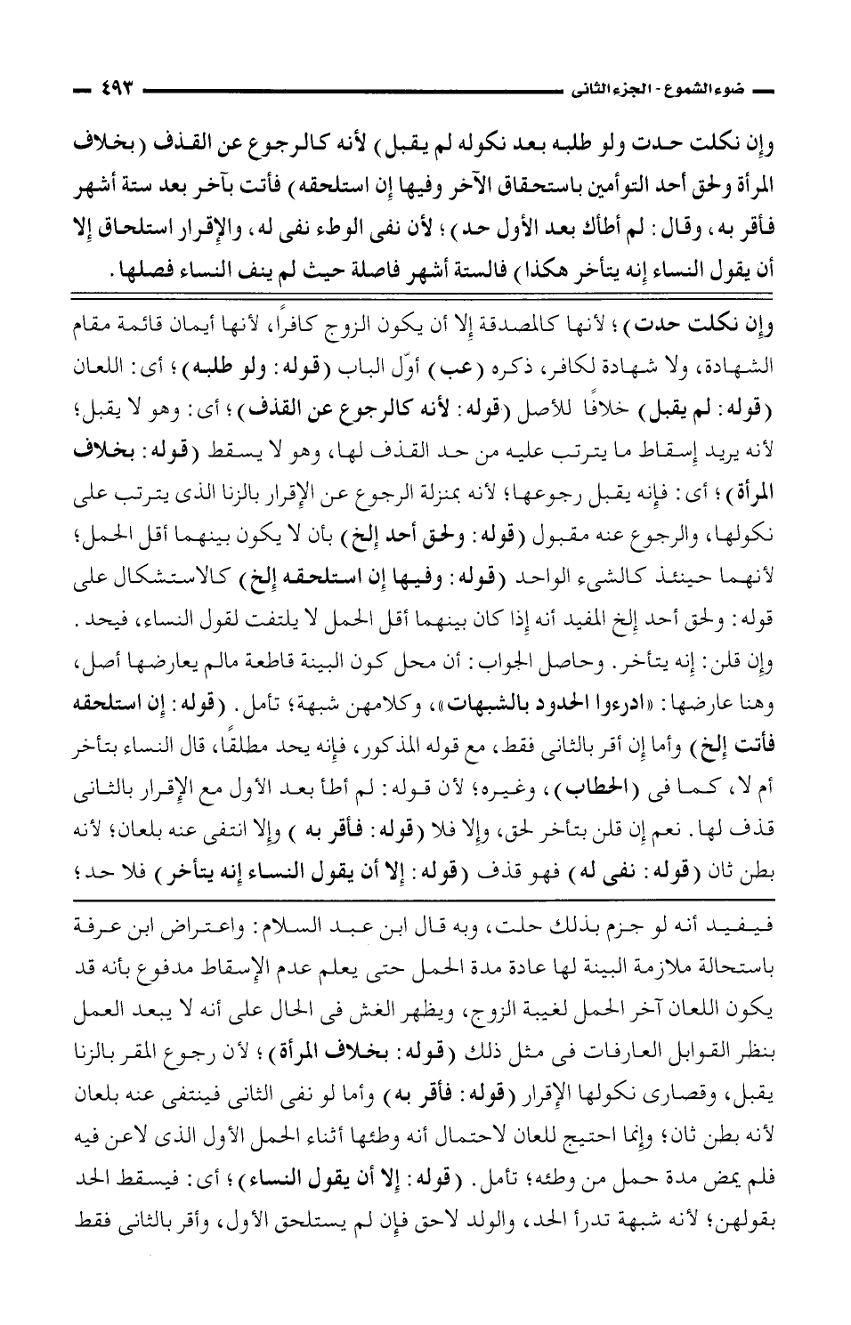 فيفيد أنه لو جزم بذلك حلت، وبه قال ابن عبد السلام: واعتراض ابن عرفة باستحالة ملازمة البينة لها عادة مدة الحمل حتى يعلم عدم الإسقاط مدفوع بأنه قد يكون اللعان آخر الحمل لغيبة الزوج، ويظهر الغش في الحال على أنه لا يبعد العمل بنظر القوابل العارفات في مثل ذلك (قوله: بخلاف المرأة)؛ لأن رجوع المقر بالزنا يقبل، وقصارى نكولها الإقرار (قوله: فأقر به) وأما لو نفى الثاني فينتفي عنه بلعان لأنه بطن ثان؛ وإنما احتيج للعان لاحتمال أنه وطئها أثناء الحمل الأول الذي لاعن فيه فلم يمض مدة حمل من وطئه؛ تأمل. (قوله: إلا أن يقول النساء)؛ أي: فيسقط الحد بقولهن؛ لأنه شبهة تدرأ الحد، والولد لاحق فإن لم يستلحق الأول، وأقر بالثاني فقط