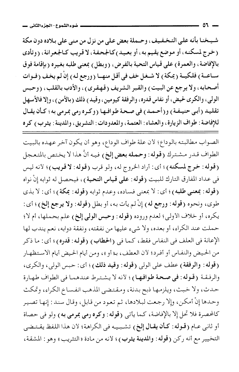 شيخنا بأنه على التخفيف، وحملة بعض على من نزل من منى على بلاده دون مكة (خرج لمسكنه، أو موضع يقيم به، أو بعيد) كالجحفة، لا قريب كالجعرانة، (وتأدى بالإفاضة، والعمرة) على قياس التحية بالفرض، (وبطل) بمعنى طلبه بغيره (بإقامة فوق ساعة) فلكية (بمكة) لا شغل خف فى أقل منها (ورجع له) إن لم يخف (فوات أصحابه، ولا يرجع عن البيت) والقبر الشريف (قهقرى)، والأدب بالقلب، (وحبس الولى، والكرى لحيض، أو نفاس قدره، والرفقة كيومين، وقيد) ذلك (بالأمن)، وإلا فالأسهل تقليد (أبى حنيفة) و (أحمد) فى صحة طوافها (وكره رمى بمرمى به؛ كأن يقال للإفاضة: طواف الزيارة، والعشاء: العتمة، والمعدودات: التشريق، والمدينة: يثرب) كره