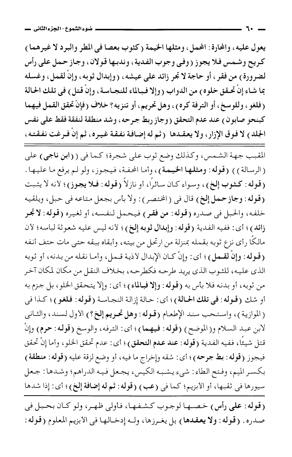 المقبب جهة الشمس، وكذلك وضع ثوب على شجرة؛ كما فى ((ابن ناجى) على (الرسالة)) (قوله: ومثلها الخيمة)، وأما المحفة، فيجوز، ولو لم يرفع ما عليها. (قوله: كثوب إلخ)، وسواء كان سائرًا، أو نازلاً (قوله: فلا يجوز)؛ لأنه لا يثبت (قوله: وجاز حمل إلخ) قال فى (المختصر): ولا بأس بجعل متاعه فى حبل، ويلقيه خلفه، والحبل فى صدره (قوله: من فقر) فيحمل لنفسه)، أو لغيره (قوله: لا تجر زائد)؛ أى: ففيه الفدية (قوله: وإبدال ثوبه إلخ)؛ لأنه ليس عليه شعوثة لباسه؛ لأن مالكًا رأى نزع ثوبه بقمله بمنزلة من ارتحل من بيته، وأبقاه ببقه حتى مات حتف أنفه من بدنه، أو ثوبه الذى عليه، للثوب الذى يريد طرحه فكطرحه، بخلاف النقل من مكان لمكان آخر من ثوبه، أو بدنه فلا بأس به (قوله: وإلا فبالماء)؛ أى: وإلا يتحقق الخلو، بل جزم به أو شك (قوله: فى تلك الحالة)؛ أى: حالة إزالة النجاسة (قوله: فلغو)؛ كذا فى (الموازية)، واستحب سند الإطعام (قوله: وهل تحريم إلخ؟ ) الأول لسند، والثانى لابن عبد السلام و (الموضح) (قوله: فيهما)؛ أى: الترفه، والوسخ (قوله: حرم) وإن قتل شيئًا، ففيه الفدية (قوله: عند عدم التحقق)؛ أى: عدم تحقق الخلو، وأما إن تحقق فيجوز (قوله: بط جرحه)؛ أى: شقه وإخراج ما فيه، أو وضع لزقة عليه (قوله: منطقة) بكسر الميم، وفتح الطاء: شئ يشبه الكيس، يجعل فيه الدراهم؛ وشدها: جعل سيورها فى ثقبها، أو الأبزيم؛ كما فى (عب) (قوله: ثم له إضافة إلخ)؛ أى: إذا شدها