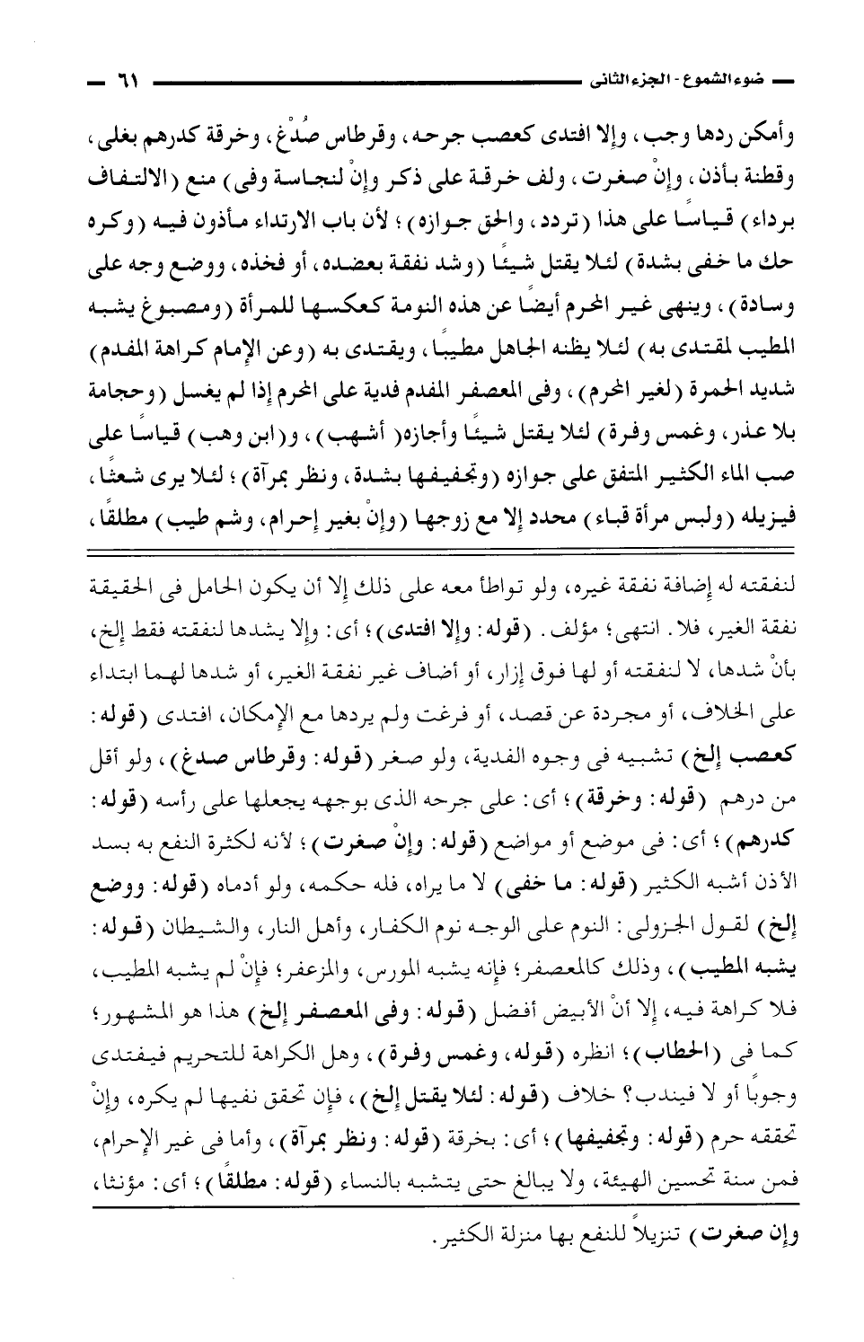 لنفقته له إضافة نفقة غيره، ولو تواطأ معه على ذلك إلا أن يكون الحامل فى الحقيقة نفقة الغير، فلا. انتهى؛ مؤلف. (قوله: وإلا افتدى)؛ أى: وإلا يشدها لنفقته فقط إلخ، بأن شدها، لا لنفقته أو لها فوق إزار، أو أضاف غير نفقة الغير، أو شدها لهما ابتداء على الخلاف، أو مجردة عن قصد، أو فرغت ولم يردها مع الإمكان، افتدى (قوله: كعصب إلخ) تشبيه فى وجوه الفدية، ولو صغر (قوله: وقرطاس صدغ)، ولو أقل من درهم؛ أى: فى موضع أو مواضع (قوله: و؟ إن صغرت)؛ لأنه لكثرة النفع به بسد الأذن أشبه الكثير (قوله: ما خفى) لا ما يراه، فله حكمه، ولو أدماه (قوله: ووضع إلخ) لقول الجزولى: النوم على الوجه نوم الكفار، وأهل النار، والشيطان (قوله: يشبه المطيب)، وذلك كالمعصفر؛ فإنه يشبه المورس، والمزعفر؛ فإن لم يشبه المطيب، فلا كراهة فيه، إلا أن الأبيض أفضل (قوله: وفى المعصفر إلخ) هذا هو المشهور؛ كما فى (الحطاب)؛ انظره (قوله: وغمس وفرة)، وهل الكراهة للتحريم فيفتدى وجوبًا أو لا فيندب؟ خلاف (قوله: لئلا يقتل إلخ)، فإن تحقق نفيها لم يكره، وإن تحققه حرم (قوله: وتجفيفها)؛ أى: بخرقة (قوله: ونظر بمرآة)، وأما فى غير الإحرام، فمن سنة تحسين الهيئة، ولا يبالغ حتى يتشبه بالنساء (قوله: مطلقًا)؛ أى: مؤنثا،