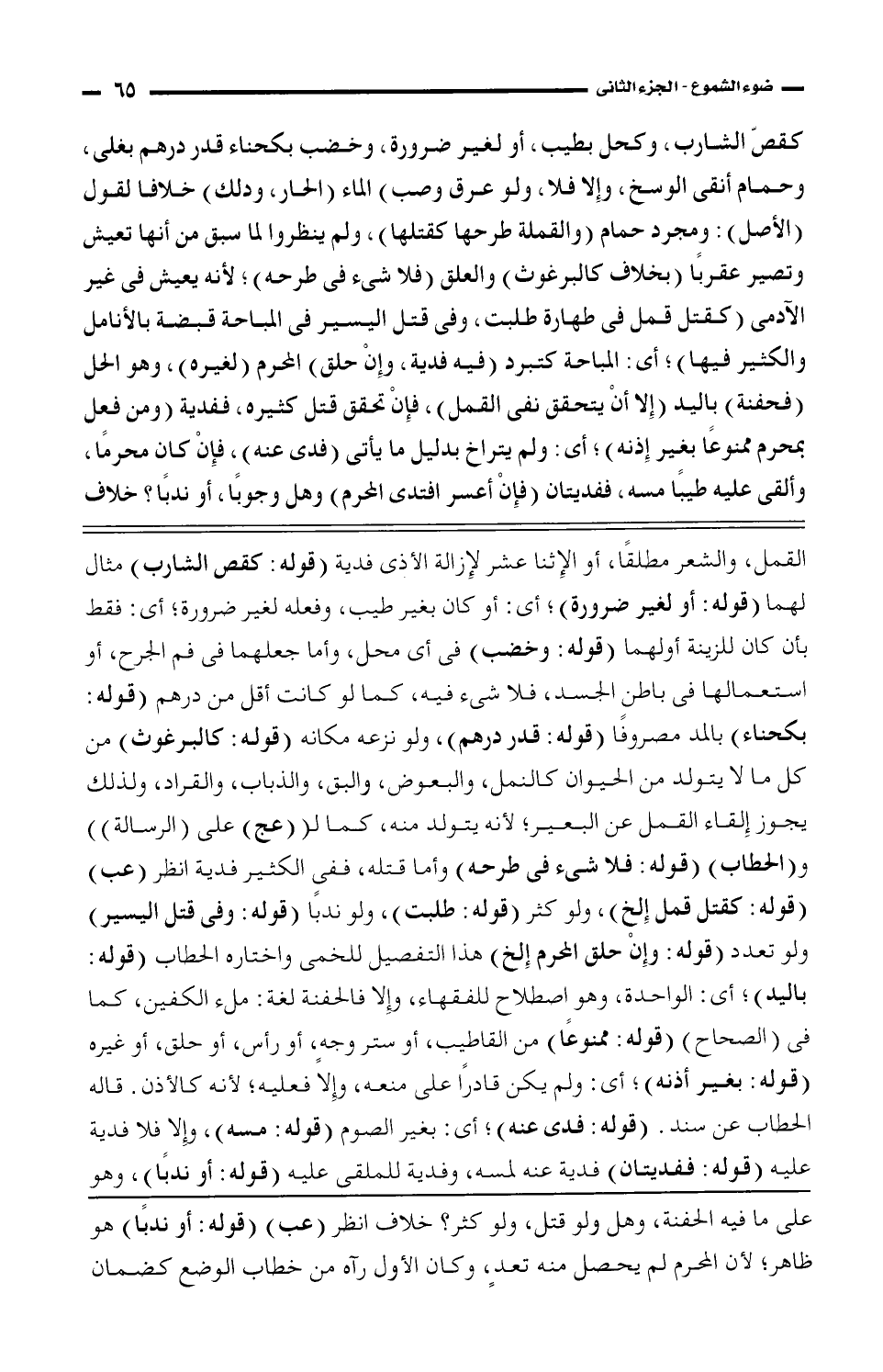 القمل، والشعر مطلقًا، أو الإثنا عشر لإزالة الأذى فدية (قوله: كقص الشارب) مثال لهما (قوله: أو لغير ضرورة)؛ أى: أو كان بغير طيب، وفعله لغير ضرورة؛ أى: فقط بأن كان للزينة أولهما (قوله: وخضب) فى أى محل، وأما جعلهما فى فم الجرح، أو استعمالها فى باطن الجسد، فلا شئ فيه، كما لو كانت أقل من درهم (قوله: بكحناء) بالمد مصروفًا (قوله: قدر درهم)، ولو نزعه مكانه (قوله: كالبرغوث) من كل ما لا يتولد من الحيوان كالنمل، والبعوض، والبق، والذباب، والقراد، ولذلك يجوز إلقاء القمل عن البعير؛ لأنه يتولد منه، كما لـ ((عج) على (الرسالة)) و (الحطاب) (قوله: فلا شئ فى طرحه) وأما قتله، ففى الكثير فدية انظر (عب) (قوله: كقتل قمل إلخ)، ولو كثر (قوله: طلبت)، ولو ندبًا (قوله: وفى قتل اليسير) ولو تعدد (قوله: وإن حلق المحرم إلخ) هذا التفصيل للخمى واختاره الحطاب (قوله: باليد)؛ أى: الواحدة، وهو اصطلاح للفقهاء، وإلا فالحفنة لغة: ملء الكفين، كما فى (الصحاح) (قوله: ممنوعًا) من القاطيب، أو ستر وجهٍ، أو رأس، أو حلق، أو غيره (قوله: بغير أذنه)؛ أى: ولم يكن قادرًا على منعه، وإلا فعليه؛ لأنه كالأذن. قاله الحطاب عن سند. (قوله: فدى عنه)؛ أى: بغير الصوم قوله: أو ندبًا)، وهو