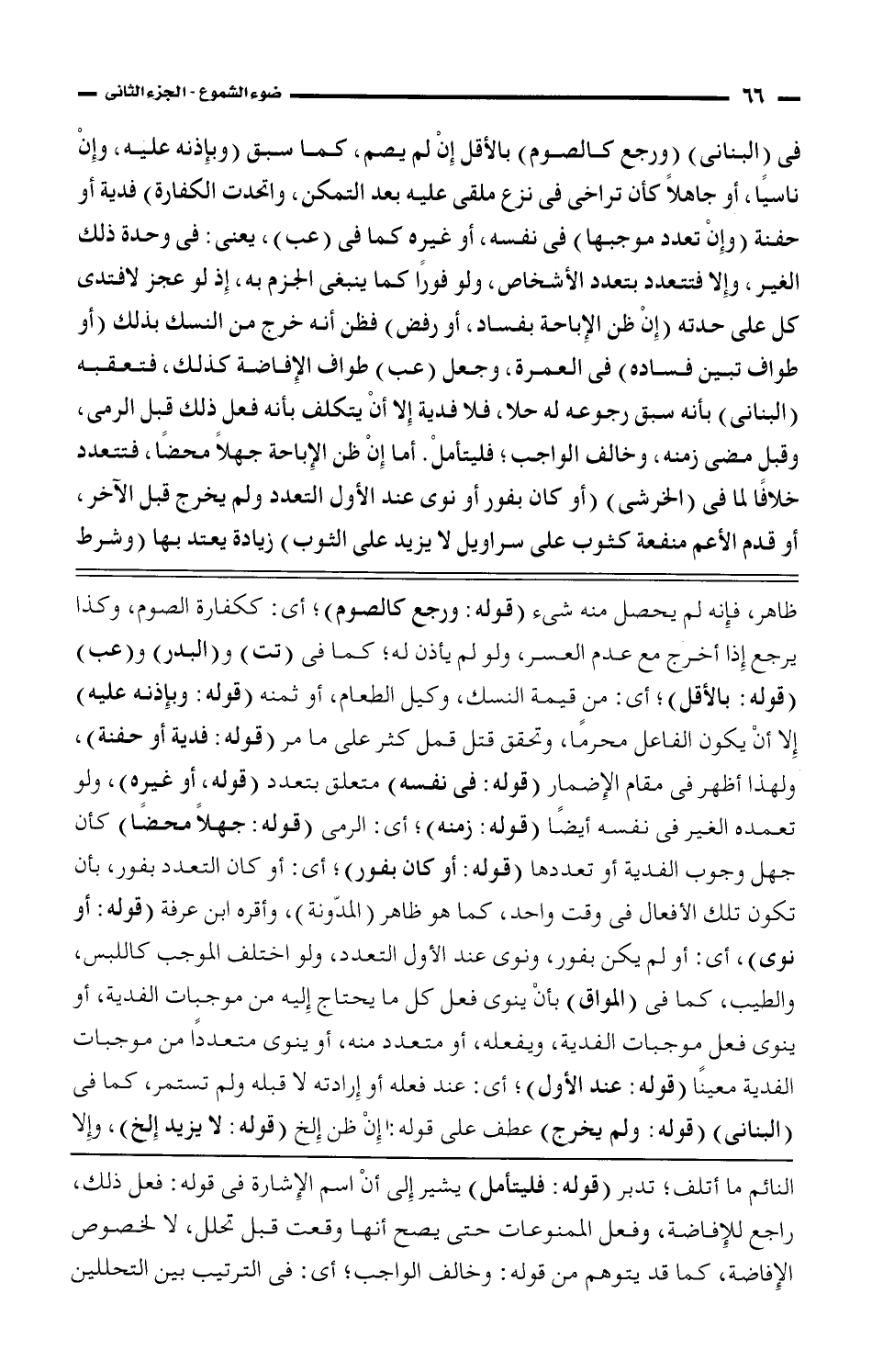 فى (البنانى) (ورجع كالصوم) بالأقل إن لم يصم، كما سبق (وبإذنه عليه، وإن ناسيًا، أو جاهلاً كأنى تراخى فى نزع ملقى عليه بعد التمكن، واتحدت الكفارة) فدية أو حفنة (وإن تعدد موجبها) فى نفسه، أو غيره كما فى (عب)، يعنى: فى وحدة ذلك الغير، وإلا فتتعدد بتعدد الأشخاص، ولو فورًا كما ينبغى الجزم به، إذ لو عجز لافتدى كل على حدته (إن ظن الإباحة بفساد، أو رفض) فظن أنه خرج من النسك بذلك (أو طواف تبين فساده) فى العمرة، وجعل (عب) طواف الإفاضة كذلك، فتعقبه (البنانى) بانه سبق رجوعه له حلا، فلا فدية إلا أن يتكلف بأنه فعل ذلك قبل الرمى، وقبل مضى زمنه، وخالف الواجب؛ فليتأمل. أما إن ظن الإباحة جهلاً محضًا، فتتعدد خلافًا لما فى (الخرشى) (أو كان بفور أو نوى عند الأول التعدد ولم يخرج قبل الآخر، أو قدم الأعم منفعة كثوب على سراويل لا يزيد على الثوب) زيادة يعتد بها (وشرط