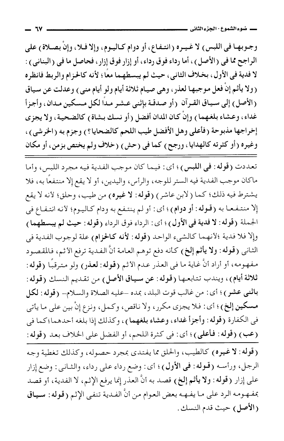 (قوله: لا غيره) كالطيب، والحلق مما يفتدى بمجرد حصوله، وكذلك تغطية وجه الرجل، ورأسه (قوله: فى الأول)؛ أى: وضع رداء على رداء، والثانى: وضع إزار على إزار (قوله: ولا يأثم إلخ) قصد به أنَّ العذر إنما يرفع الإثم، لا الفدية، أو قصد بمفهومه الرد على ما يفهه بعض العوام من أنَّ الفدية تنفى الإثم (قوله: سياق (الأصل) حيث قدم النسك.