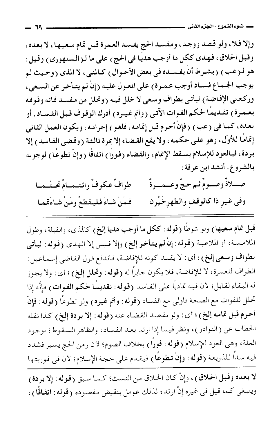 وإلا فلا، ولو قصد ووجد، ومفسد الحج يفسد العمرة قبل تمام سعيها، لا بعده، وقبل الحلاق، فهدى ككل ما أوجب هديًا فى الحج) على ما لـ (السنهورى) وقيل: هو لـ (عب) (بشرط أن يفسده فى بعض الأحوال) كالمنى، لا المذى (وحيث لم يوجب الجماع فساد أوجب عمرة) على المعول عليه (إن لم يتأخر عن السعى، وركعتى الإفاضة) ليأتى بطواف وسعى لا خلل فيه (وتحلل من مفسد فاته وقوفه بعمرة) تقديمًا لحكم الفوات الآتى (وأتم غيره) أدرك الوقوف قبل الفساد، أو بعده، كما فى (عب) (فإن أحرم قبل إتمامه، فلغو) إحرامه، ويكون العمل الثانى إتمامًا للأوّل، وهو على حكمه، ولا يقع القضاء إلا بمرة ثالثة (وقضى الفاسد) إلا بردة، فبالعود للإسلام يسقط الإتمام، والقضاء (فورًا) اتفاقًا (وإن تطوعا) لوجوبه بالشروع. أنشد ابن عرفة: