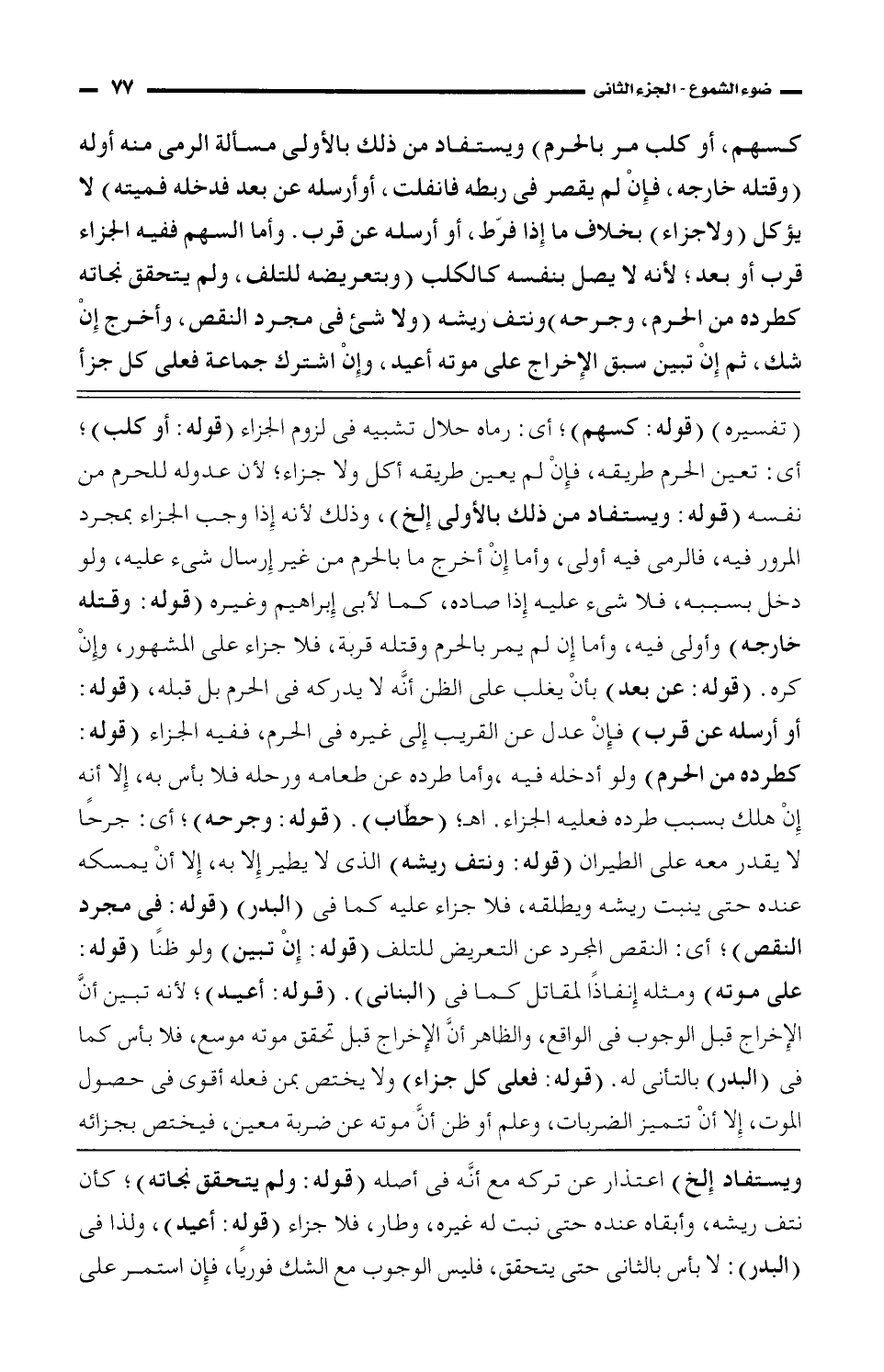 (تفسيره) (قوله: كسهم)؛ أى: رماه حلال تشبيه فى لزوم الجزاء (قوله: أو كلب)؛ أى: تعين الحرم طريقه، فإن لم يعين طريقه، فإن لم يعين طريقه أكل ولا جزاء؛ لأن عدوله للحرم من نفسه (قوله: ويستفاد من ذلك بالأولى إلخ)، وذلك لأنه إذا وجب الجزاء بمجرد المرور فيه، فالرمى فيه أولى، وأما إن أخرج ما بالحرم من غير إرسال شئ عليه، ولو دخل بسببه، فلا شئ عليه إذا صاده، كما لأبى إبراهيم وغيره (قوله: وقتله خارجه) وأولى فيه، وأما لم يمر بالحرم وقتله قربة، فلا جزاء على المشهور، وإن كره. (قوله: عن بعد) بأن يغلب على الظن أنه لا يدركه فى الحرم قبله، (قوله: أو أرسله عن قرب) فإن عدل عن القريب إلى غيره فى الحرم، ففيه الجزاء (قوله: كطرده من الحرم) ولو أدخله فيه، وأما طرده عن طعامه ورحله فلا بأس به، إلا أنه إن هلك بسبب طرده فعليه الجزاء, أهـ؛ (حطّاب). (قوله: وجرحه)؛ أى: جرحًا لا يقدر معه على الطيران (قوله: أعيد)؛ لأنه تبين أنَّ الإخراج قبل الوجوب فى الواقع، والظاهر أنَّ الإخراج قبل الوجوب فى الواقع، والظاهر أنَّ الإخراج قبل تحقق موته موسع، فلا بأس كما فى (البدر) بالتأنى له. (قوله: فعلى كل جزاء) ولا يختص بمن فعله أقوى فى حصول الموت، إلا أن تتميز الضربات، وعلم أو ظن أنَّ موته عن ضربة معين، فيختص بجزائه