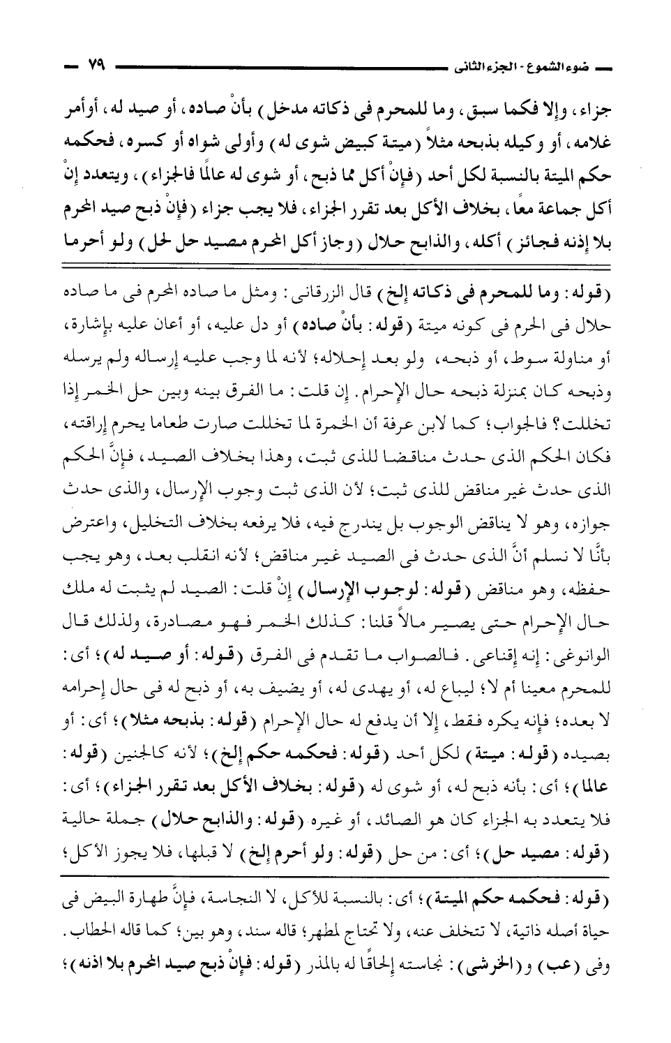 جزاء، وإلا فكما سبق، وما للمحرم فى ذكاته مدخل) بأن صاده، أو صيد له، أو أمر غلامه، أو وكيله بذبحه مثلاً (ميتة كبيض شوى له) وأولى شواه أو كسره، فحكمه حكم الميتة بالنسبة لكل أحد (فإن أكل مما ذبح، أو شوى له عالمًا فالجزاء)، ويتعدد إن أكل جماعة معًا، بخلاف الأكل بعد تقرر الجزاء، فلا يجب جزاء (فإن ذبح صيد المحرم بلا إذنه فجائز) أكله. والذابح حلال (وجاز أكل المحرم مصيد حل لحل) ولو أحر ما