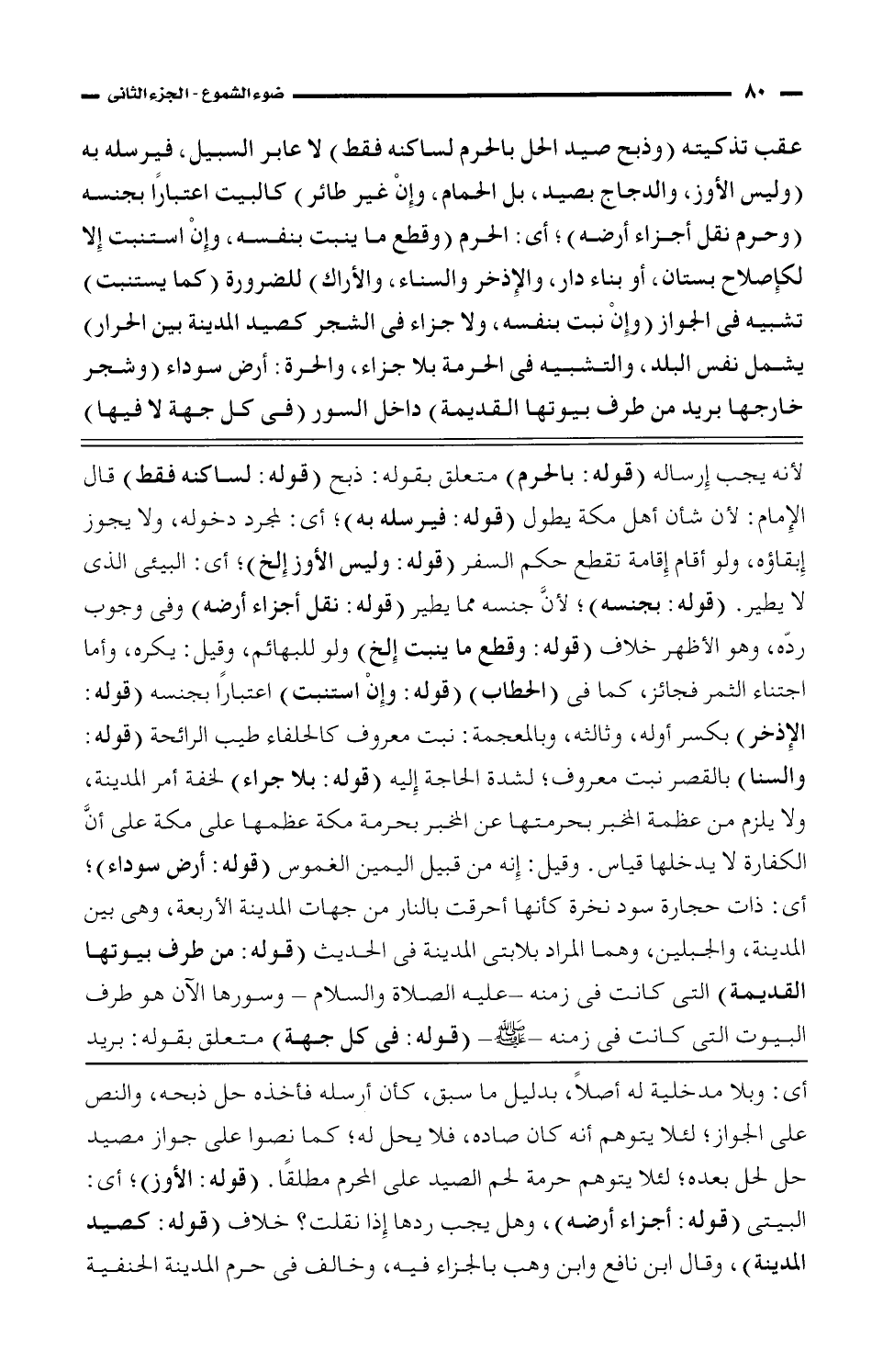 لأنه يجب إرساله (قوله: بالحرم) متعلق بقوله: ذبح (قوله: لساكنه فقط) قال الإمام: لأن شأن أهل مكة يطول (قوله: فيرسله به)؛ أى: لمجرد دخوله، ولا يجوز إبقاؤه، ولو أقام إقامة تقطع حكم السفر (قوله: وليس الأوز إلخ)؛ أى: البيئى الذى لا يطير. (قوله: بجنسه)؛ لأنَّ جنسه مما يطير (قوله: نقل أجزاء أرضه) وفى وجوب ردّه، وهو الأزهر خلاف (قوله: وقطع ما ينبت إلخ) ولو للبهائم، وقيل: ويكره، وأما اجتناء الثمر فجائز، كما فى (الحطاب) (قوله: وإن استنبت) اعتبارًا بجنسه (قوله: الإذخر) بكسر أوله، وثالثه، وبالمعجمة: نبت معروف كالحلفاء طيب الرائحة (قوله: والسنا) بالقصر نبت معروف؛ لشدة الحاجة إليه (قوله: بلا جراء) لخفة أمر المدينة، ولا يلزم من عظمة المخبر بحرمتها عن المخبر بحرمة مكة عظمها على مكة على أنَّ الكفارة لا يدخلها قياس. وقيل: إنه من قبيل اليمين الغموس (قوله: أرض سوداء)؛ أى: ذات حجارة سود نخرة كأنها أحرقت بالنار من جهات المدينة الأربعة، وهى بين المدينة، والجبلين، وهما المراد بلابتى المدينة فى الحديث (قوله: من طرف بيوتها القديمة) التى كانت فى زمنه -عليه الصلاة والسلام- وسورها الآن هو طرف البيوت التى كانت فى زمنه -صلى الله عليه وسلم- (قوله: فى كل جهة) متعلق بقوله: بريد
