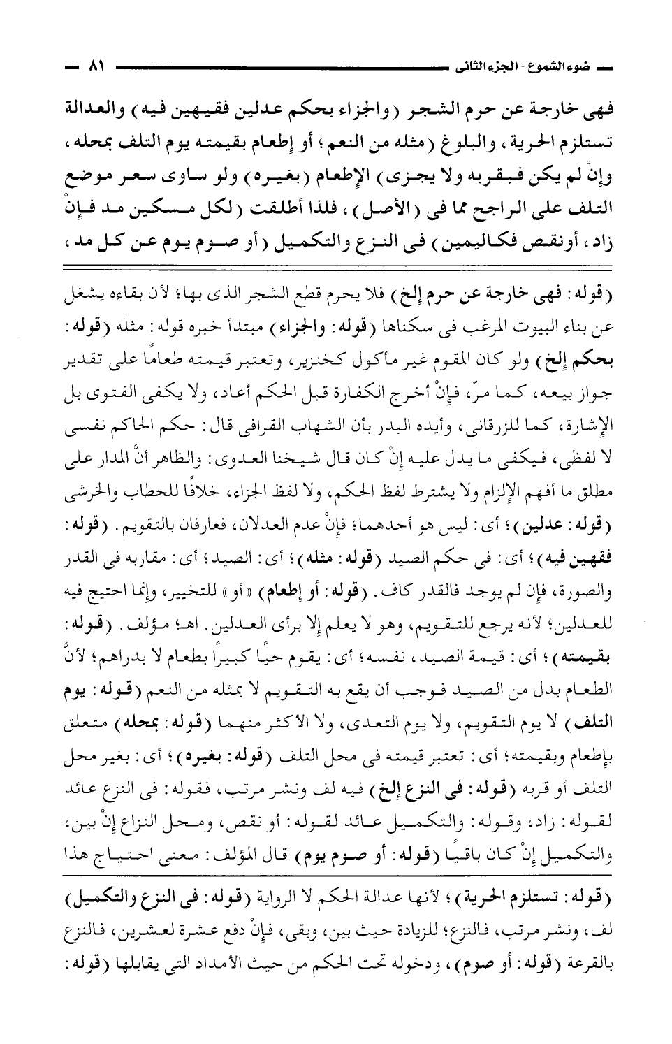 فهى خارجة عن حرم الشجر (والجزاء بحكم عدلين فقيهين فيه) والعدالة تستلزم الحرية، والبلوغ (مثله من النعم؛ او إطعام بقيمته يوم التلف بمحله، وإن لم يكن فبقربه ولا يجزى) الإطعام (بغيره) ولو ساوى سعر موضع التلف على الراجح مما فى (الأصل)، فلذا أطلقت (لكل مسكين مد فإن واد، أو نقص فكاليمين) فى النزع والتكميل (أو صوم يوم عن كل مد،