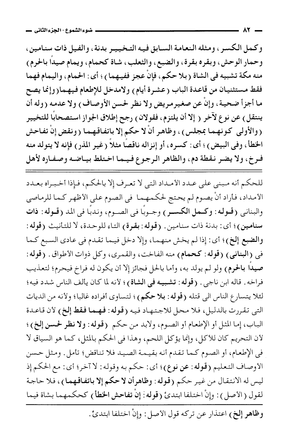 للحكم أنه مبنى على عدد الأمداد التى لا تعرف إلا بالحكم، فإذا أخبره بعدد الأمداد، فأراد أن يصوم لم يحتج لحكمهما فى الصوم على الأظهر كما للرماصى والبنانى (قوله: وكمل الكسر) وجوبًا فى الصوم، وندبًا فى المد (قوله: ذات سنامين)؛ أى: بدنة ذات سنامين. (قوله: بقرة) التاء للوحدة، لا للتأنيث (قوله: والضبع إلخ)؛ أى: إذا لم يخش منهما، وإلا دخل فيما تقدم فى عادى السبع كما فى (البنانى) (قوله: كحمام) منه الفاخت، والقمرى، وكل ذوات الأطواق. (قوله: صيدًا بالحرم) ولو لم يولد به، وأما بالحل فجائز إلا أن يكون له فراخ فيحرم؛ لتعذيب فراخه. قاله ابن ناجى. (قوله: تشبيه فى الشاة)؛ لأنه لما كان يألف الناس شدد فيه؛ لئلا يتسارع الناس إلى قتله (قوله: بلاحكم)؛ لتساوى أفراده غالبا؛ ولأنه من الديات التى تقررت بالدليل، فلا محل للاجتهاد فيه (قوله: فهما فقط إلخ) لأن قاعدة الباب، إما المثل أو الإطعام أو الصوم، ولابد من حكم (قوله: ولا نظر لحسن إلخ)؛ لأن التحريم كان للأكل، وإنما يؤكل اللحم، وهذا فى الحكم بالمثل، كما هو السياق لا فى الإطعام، أو الصوم كما تقدم أنه بقيمة الصيد فلا تناقض؛ تأمل. ومثل حسن الأوصاف التعليم (قوله: عن نوع)؛ أى: حكم به وقوله: لا آخر؛ أى: مع الحكم إذا ليس له الانتقال من غير حكم (قوله: وظاهر أن لا حكم إلا باتفاقهما)، فلا حاجة لقول (الأصل): وإن اختلفا ابتدئ (قوله: إن تفاحش الخطأ) محكمهما بشاة فيما