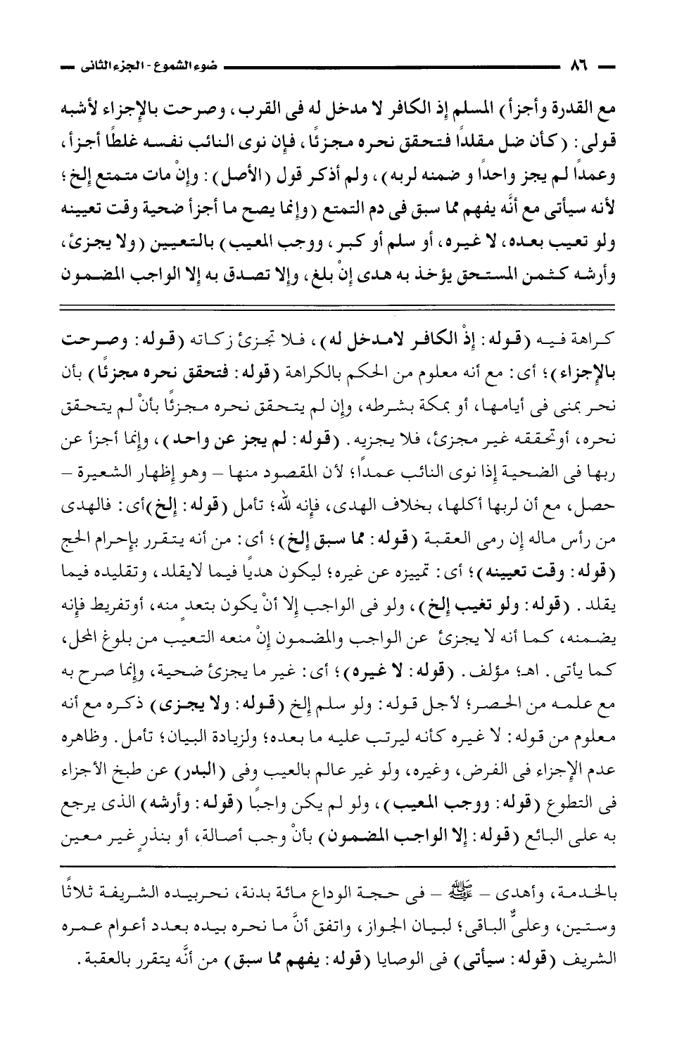 كراهة فيه (قوله: إذ الكافر لا مدخل له)، فلا تجزئ زكاته (قوله: وصرحت بالإجزاء)؛ أى: مع أنه معلوم من الحكم بالكراهة (قوله: فتتحقق نحره مجزئًا) بأن نحر بمنى فى أيامها، أو بمكة بشرطه، وإن لم يتحقق نحره مجزئًا بأن لم يتحقق نحره مجزئًا بأن لم يتحقق نحره، أو تحققه غير مجزئ، فلا يجزئه. (قوله: لم يجز عن واحد)، وإنما أجزأ عن ربها فى الضحية إذا نوى النائب عمدًا؛ لأن المقصود منها -وهو إزهار الشعيرة- حصل، مع أن لربها أكلها، بخلاف الهدى، فإن الله؛ تأمل (قوله: إلخ) أى: فالهدى من رأس ماله إن رمى العقبة (قوله: مما سبق إلخ)؛ أى: من أنه يتقرر بإحرام الحج (قوله: وقت تعيينه)؛ أى: تمييزه عن غيره؛ ليكون هديًا فيما لا يقلد، وتقليده فيما يقلده. (قوله: ولو تغيب إلخ)، ولو فى الواجب إلا أن يكون بتعدٍ منه، أو تفريط فإنه يضمنه، كما أنه لا يجزئ عن الواجب والمضمون إن منعه التعيب من بلوغ المحل، كما ياتى. أهـ؛ مؤلف. (قوله: لا غيره)؛ أى: غير ما يجزئ ضحية، وإنما صرح به مع علمه من الحصر؛ لأجل قوله: ولو سلم إلخ (قوله: ولا يجزى) ذكره مع أنه معلوم من قوله: لا غيره كأنه ليرتب عليه ما بعده؛ ولزيادة البيان؛ تأمل. وظاهره عدم الإجزاء فى الفرض، وغيره، ولو غير عالم بالعيب وفى (البدر) عن طبخ الأجزاء فى التطوع (قوله: ووجب المعيب)، ولو لم يكن واجبًا (قوله: وأرشه) الذى يرجع به على البائع (قوله: إلا الواجب المضمون) بأن وجب أصالة، أو بنذرٍ غير معين