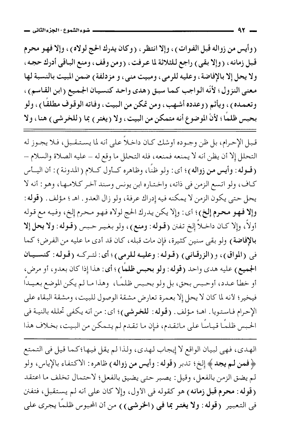 الهدى، فهى لبيان الواقع لا إيجاب لهدى، ولذا لم يقل فيها؛ كما قيل فى التمتع {فمن لم يجد} إلخ؛ تدبر (قوله: وأيس من زواله) ظاهره: الاكتفاء بالإياس، ولو لم يضق الزمن بالفعل، وقيل: يصبر حتى يضيق بالفعل؛ لاحتمال تخلف ما اعتقد (قوله: محرم قبل زمانه) هو كقوله فى الأول، وإلا كان على أنه لم يستقبل، فتفنن فى التعبير (قوله: ولا يغتر بما فى (الخرشى)) من أن المحبوس ظلمًا يجرى على