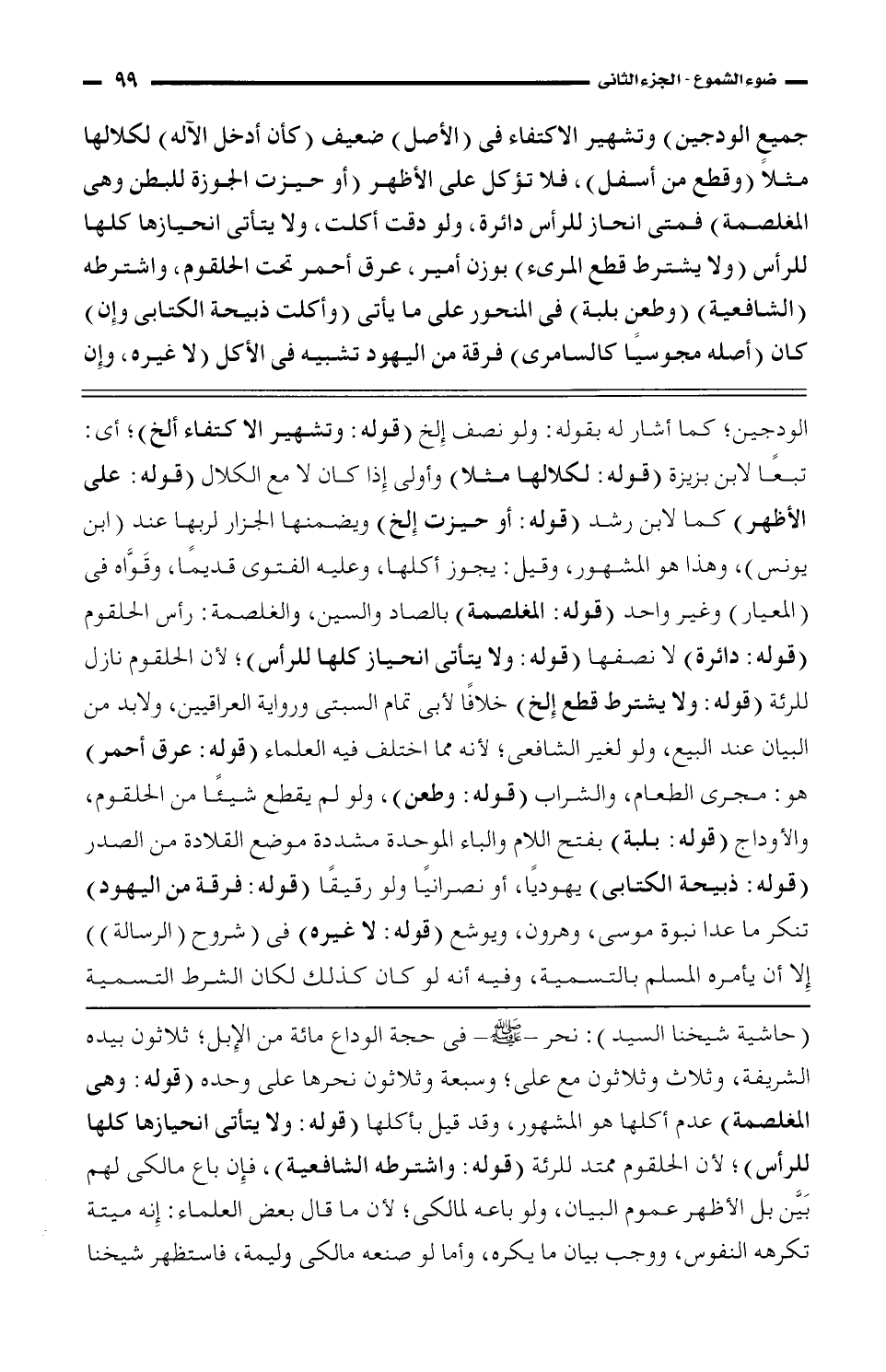 (حاشية شيخنا السيد): نحر -صلى الله عليه وسلم- فى حجة الوداع مائة من الإبل؛ ثلاثون بيده الشريفة، وثلاث وثلاثون مع على؛ وسبعة وثلاثون نحرها على وحده (قوله: وهى المغلصمة) عدم أكلها هو المشهور، وقد قيل بأكلها (قوله: ولا يتأتى انحيازها كلها للرأس)؛ لأن الحلقوم ممتد للرئة (قوله: واشترطه الشافعية)، فإن باع مالكى لهم بيَّن بل الأظهر عموم البيان، ولو باعه لمالكى؛ لأن ما قال بعض العلماء: أنه ميتة تكرهه النفوس، ووجب بيان ما يكره، وأما لو صنعه مالكى وليمة، فاستظهر شيخنا