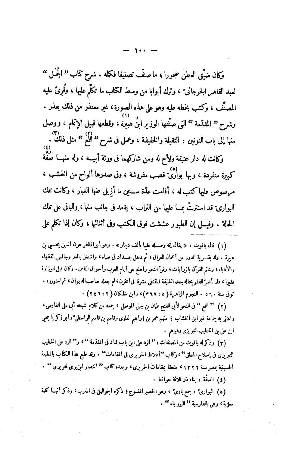 وشرح المقدّمة التى صنّفها الوزير ابن هبيرة «1»، وقطعها قبيل الإتمام، ووصل منها إلى باب النونين: الثقيلة والخفيفة، وعمل فى شرح اللمع «2» مثل ذلك «3».