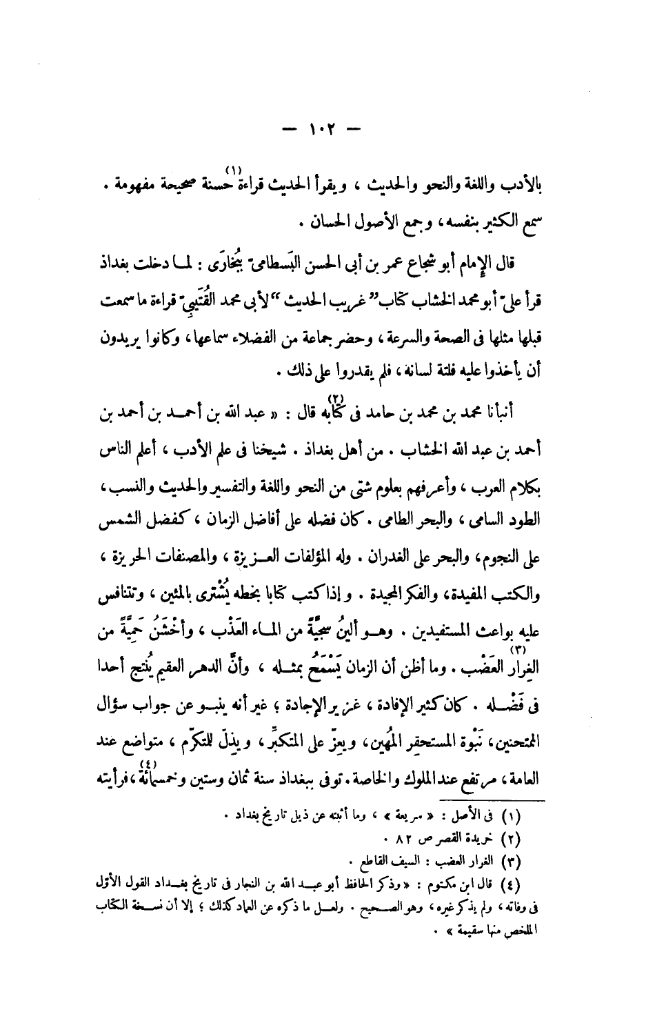 أنبأنا محمد بن محمد بن حامد فى كتابه «2» قال: «عبد الله بن أحمد بن أحمد بن أحمد بن عبد الله الخشاب. من أهل بغداذ. شيخنا فى علم الأدب، أعلم الناس بكلام العرب، وأعرفهم بعلوم شتى من النحو واللغة والتفسير والحديث والنسب، الطود السامى، والبحر الطامى. كان فضله على أفاضل الزمان، كفضل الشمس على النجوم، والبحر على الغدران. وله المؤلفات العزيزة، والمصنفات الحريزة، والكتب المفيدة، والفكر المجيدة. وإذا كتب كتابا بخطه يشترى بالمئين، وتتنافس عليه بواعث المستفيدين. وهو ألين سجيّة من الماء العذب، وأخشن حميّة من الغرار «3» العضب. وما أظن أن الزمان يسمح بمثله، وأنّ الدهر العقيم ينتج أحدا فى فضله. كان كثير الإفادة، غزير الإجادة؛ غير أنه ينبو عن جواب سؤال الممتحنين، نبوة المستحقر المهين، ويعزّ على المتكبّر، ويذلّ للمتكّرم، متواضع عند العامة، مرتفع عند الملوك والخاصة. توفى ببغداذ سنة ثمان وستين وخمسمائة «4»، فرأيته