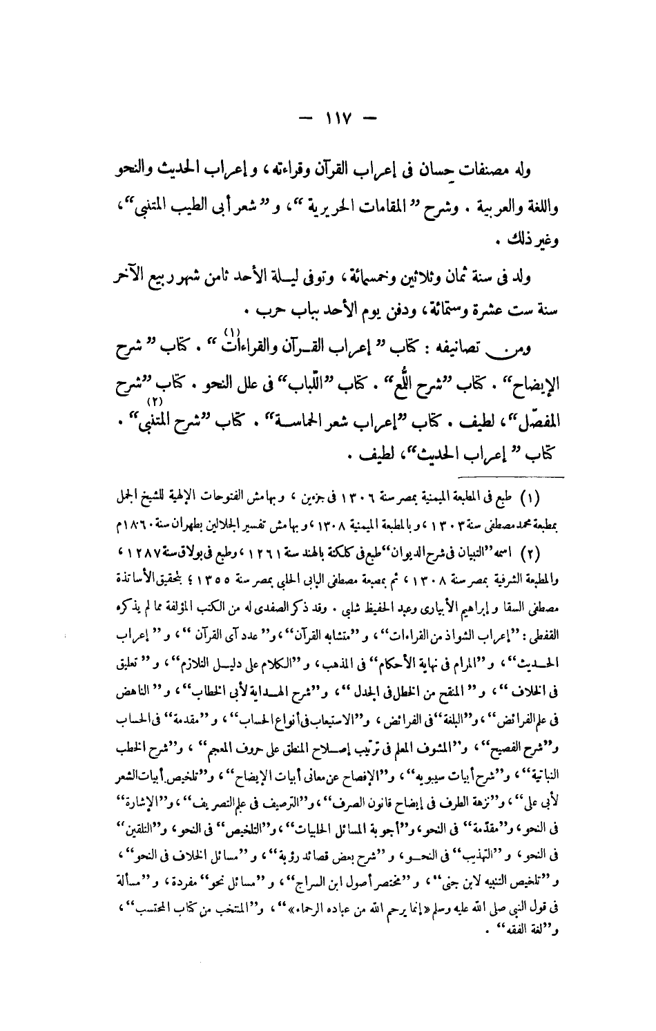 وله مصنفات حسان فى إعراب القرآن وقراءته، وإعراب الحديث والنحو واللغة والعربية. وشرح المقامات الحريرية، وشعر أبى الطيب المتنبى، وغير ذلك.
