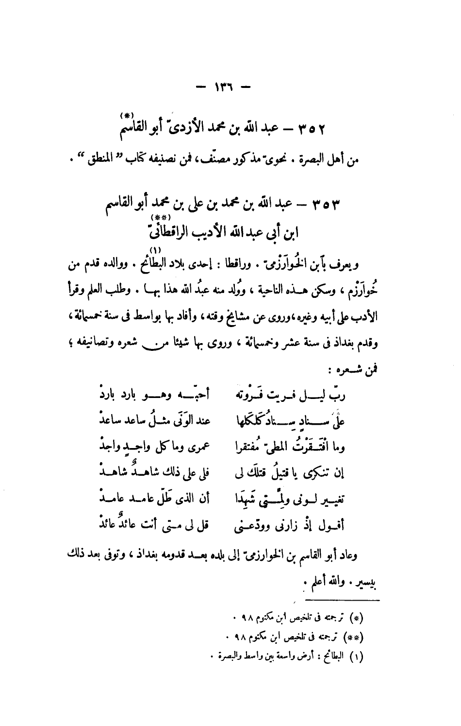 ويعرف بابن الخوارزمىّ. وراقطا: إحدى بلاد البطائح «1». ووالده قدم من خوارزم، وسكن هذه الناحية، وولد منه عبد الله هذا بها. وطلب العلم وقرأ الأدب على أبيه وغيره، وروى عن مشايخ وقته، وأفاد بها بواسط فى سنة خمسمائة، وقدم بغداذ فى سنة عشر وخمسمائة، وروى بها شيئا من شعره وتصانيفه؛ فمن شعره: