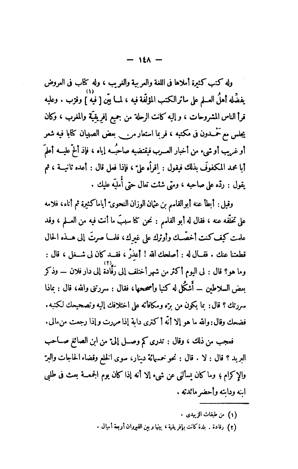 وما هو؟ قال: لى اليوم أكثر من شهر أختلف إلى رقّادة «2» إلى دار فلان- وذكر بعض السلاطين- أشكل له كتبا وأصححها، فقال: سررتنى والله، قال: بماذا سررتك؟ قال: بما يكون من برّه ومكافأته على اختلافك إليه وتصحيحك لكتبه.