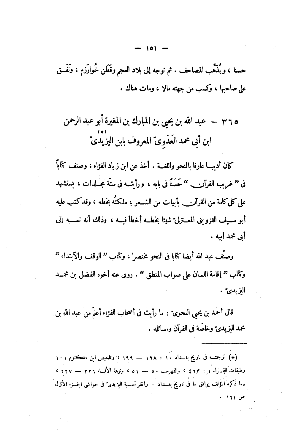 [1] ترجمته فى تاريخ بغداد 10: 198 - 199، وتلخيص ابن مكتوم 101 وطبقات القراء 1: 463، والفهرست 50 - 51، ونزهة الألباء 226 - 227، وما ذكره المؤلف يوافق ما فى تاريخ بغداد. وانظر نسبة اليزيدىّ فى حواشى الجزء الأوّل ص 161.