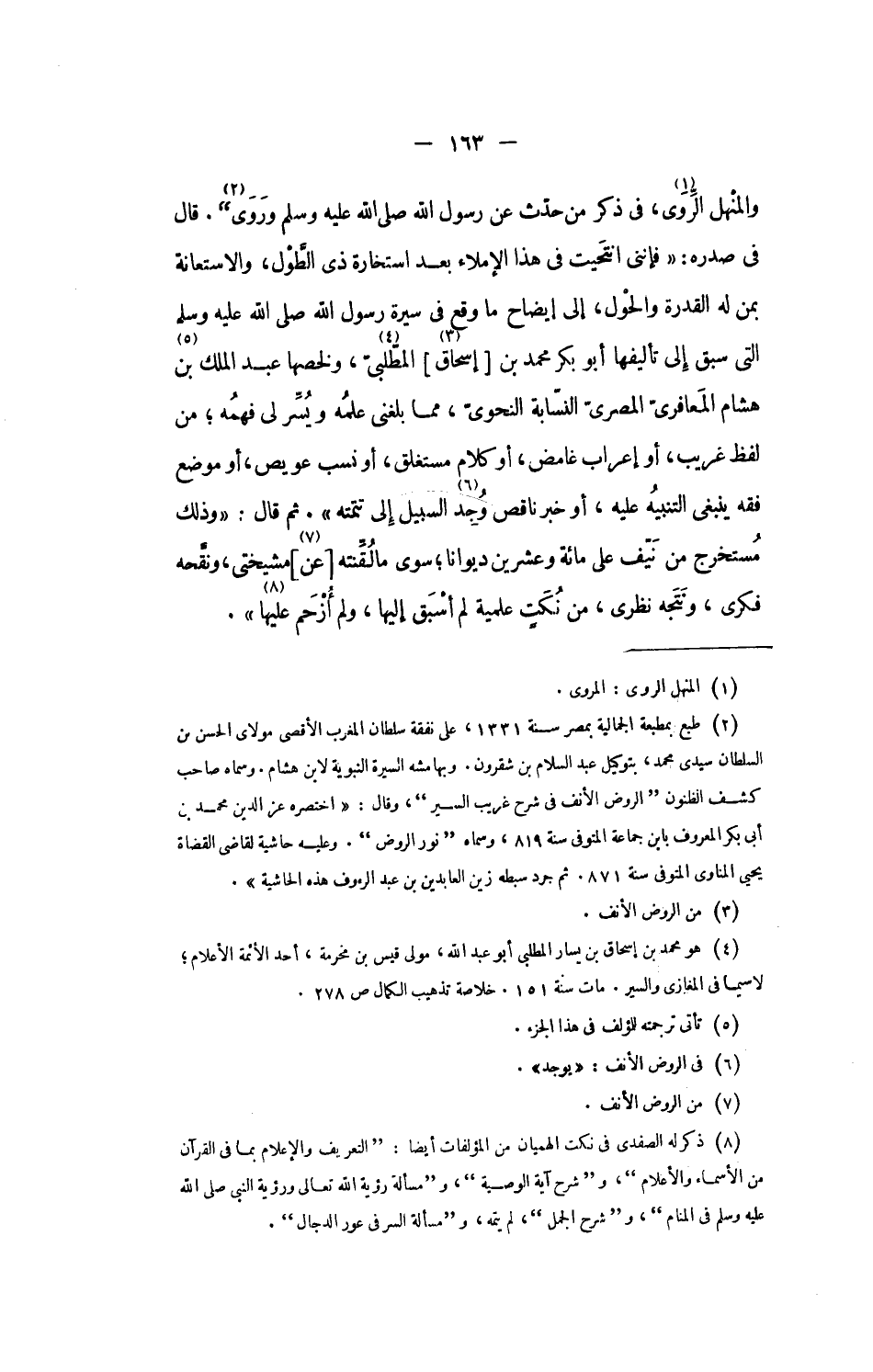 والمنهل الرّوى، «1» فى ذكر من حدّث عن رسول الله صلى الله عليه وسلم وروى «2». قال فى صدره: «فإننى انتحيت فى هذا الإملاء بعد استخارة ذى الطّول، والاستعانة بمن له القدرة والحول، إلى إيضاح ما وقع فى سيرة رسول الله صلى الله عليه وسلم التى سبق إلى تأليفها أبو بكر محمد بن [إسحاق] «3» المطّلبىّ، «4» ولخصها عبد الملك بن «5» هشام المعافرىّ المصرىّ النسّابة النحوىّ، مما بلغنى علمه ويسّر لى فهمه؛ من لفظ غريب، أو إعراب غامض، أو كلام مستغلق، أو نسب عويص، أو موضع فقه ينبغى التنبيه عليه، أو خبر ناقص وجد «6» السبيل إلى تتمته». ثم قال: «وذلك مستخرج من نيّف على مائة وعشرين ديوانا؛ سوى ما لقّنته [عن] «7» مشيختى، ونقّحه فكرى، ونتجه نظرى، من نكت علمية لم أسبق إليها، ولم أزحم عليها» «8».