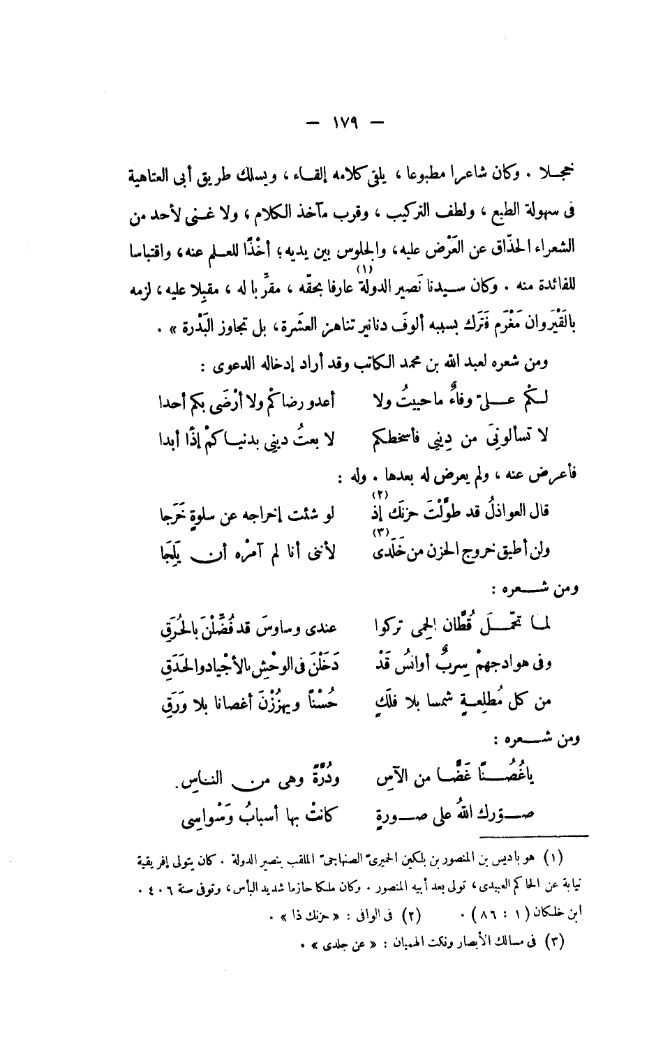 خجلا. وكان شاعرا مطبوعا، يلقى كلامه إلقاء، ويسلك طريق أبى العتاهية فى سهولة الطبع، ولطف التركيب، وقرب مآخذ الكلام، ولا غنى لأحد من الشعراء الحذّاق عن العرض عليه، والجلوس بين يديه؛ أخذا للعلم عنه، واقتباسا للفائدة منه. وكان سيدنا نصير الدولة «1» عارفا بحقّه، مقرّبا له، مقبلا عليه، لزمه بالقيروان مغرم فترك بسببه ألوف دنانير تناهز العشرة، بل تجاوز البدرة».
