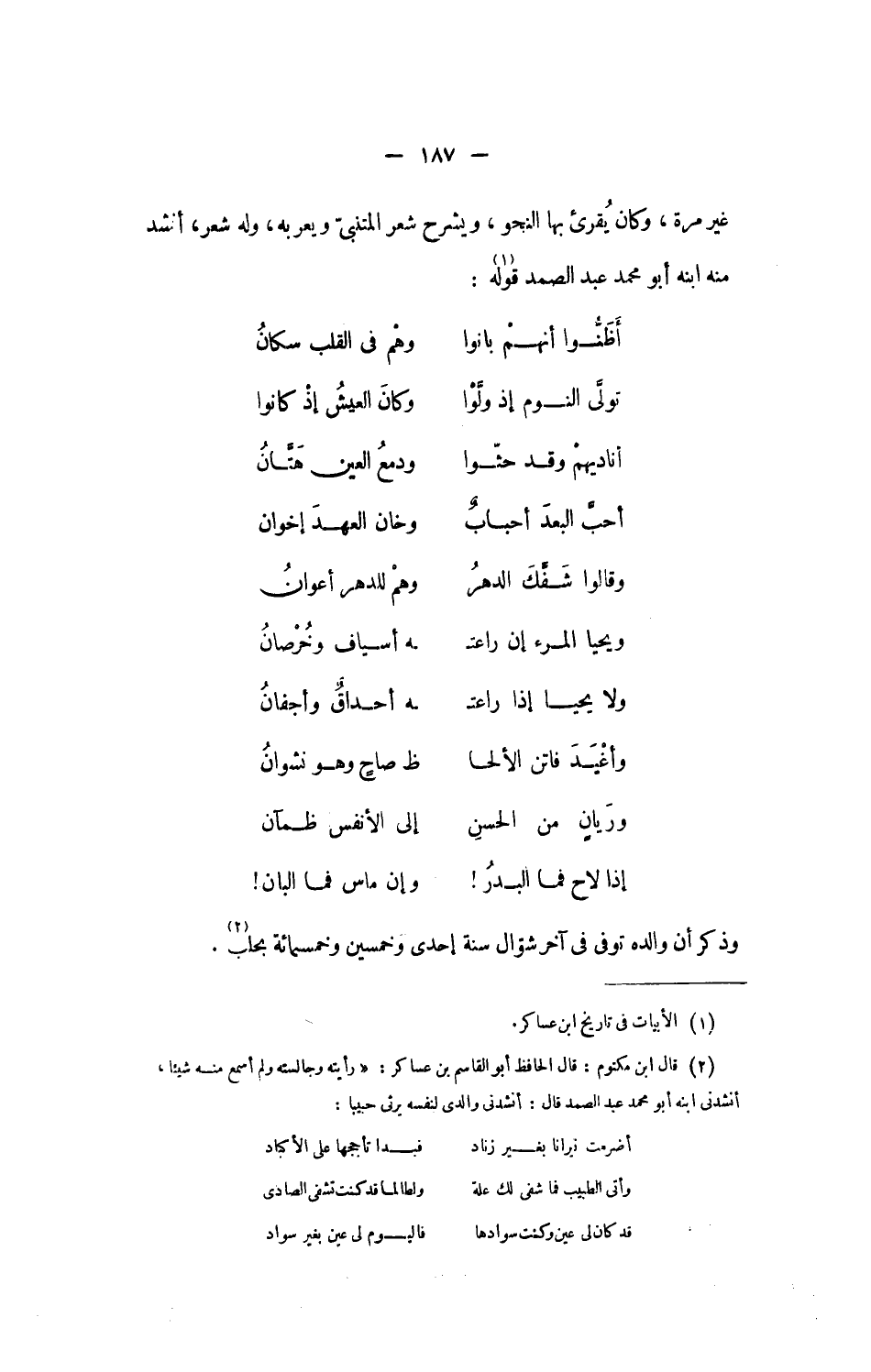 غير مرة، وكان يقرئ بها النحو، ويشرح شعر المتنبىّ ويعربه، وله شعر، أنشد منه ابنه أبو محمد عبد الصمد قوله «1»: