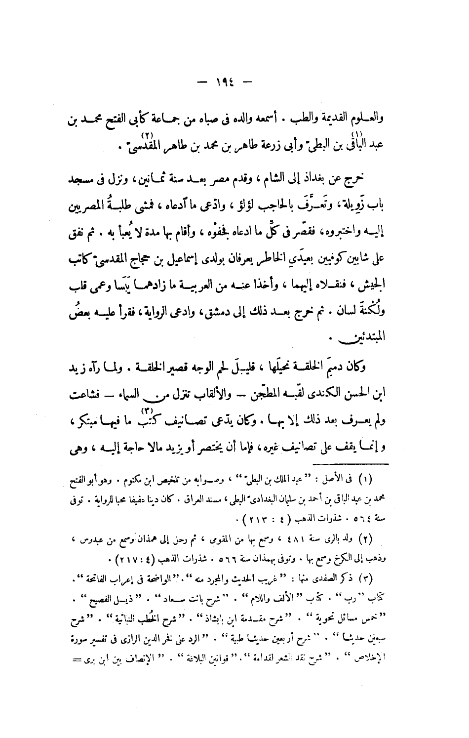 والعلوم القديمة والطب. أسمعه والده فى صباه من جماعة كأبى الفتح محمد بن عبد الباقى «1» بن البطىّ وأبى زرعة طاهر بن محمد بن طاهر المقدسىّ «2».