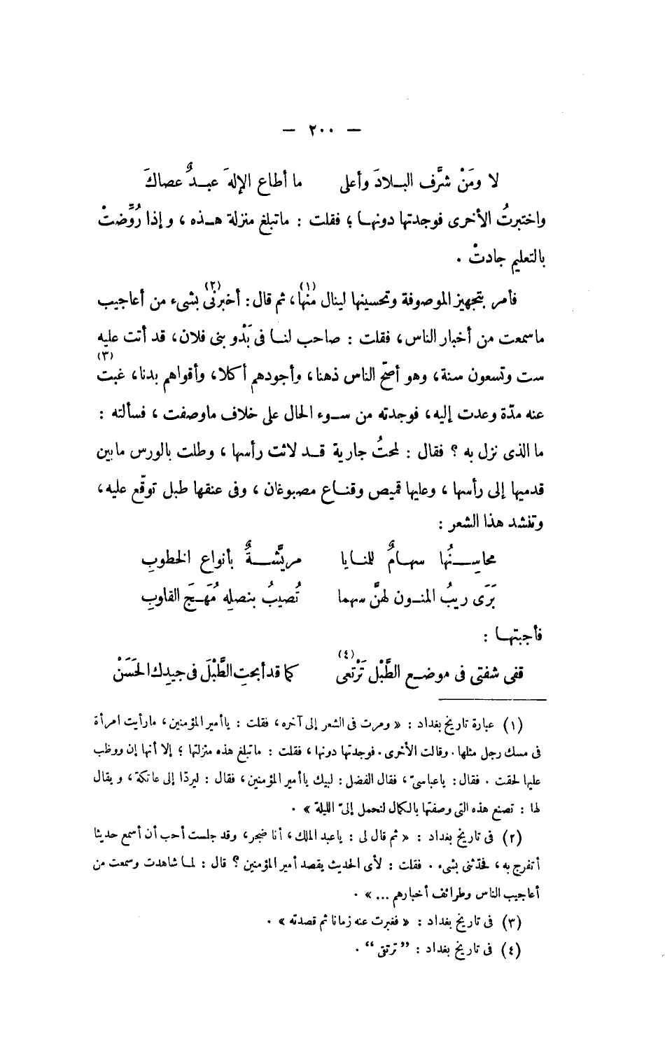 فأمر بتجهيز الموصوفة وتحسينها لينال منها «1»، ثم قال: أخبرنى «2» بشىء من أعاجيب ما سمعت من أخبار الناس، فقلت: صاحب لنا فى بدو بنى فلان، قد أتت عليه ست وتسعون سنة، وهو أصحّ الناس ذهنا، وأجودهم أكلا، وأقواهم بدنا، غبت «3» عنه مدّة وعدت إليه، فوجدته من سوء الحال على خلاف ما وصفت، فسألته: