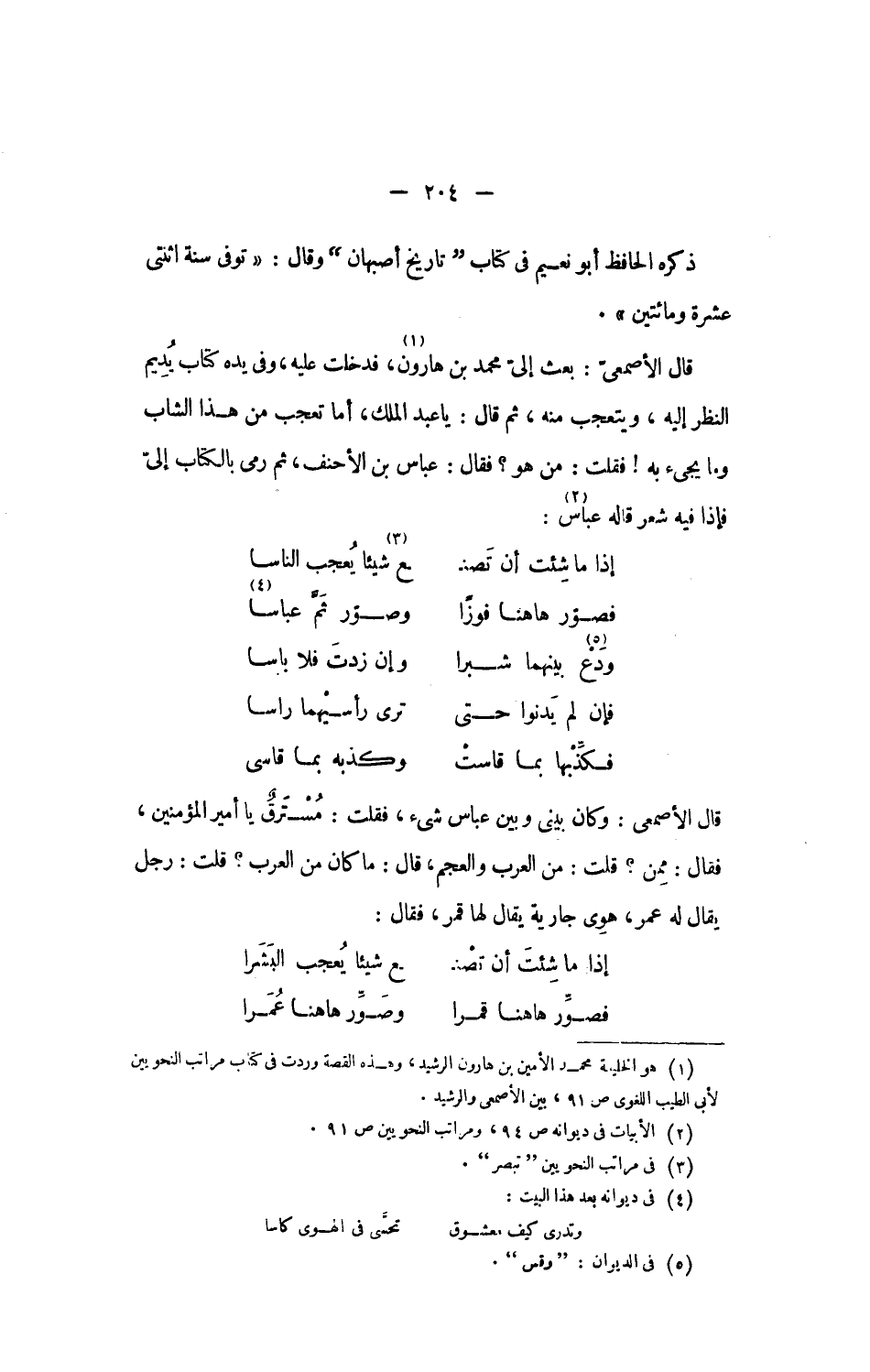 قال الأصمعى: وكان بينى وبين عباس شىء، فقلت: مسترق يا أمير المؤمنين، فقال: ممن؟ قلت: من العرب والعجم، قال: ما كان من العرب؟ قلت: رجل يقال له عمر، هوى جارية يقال لها قمر، فقال: