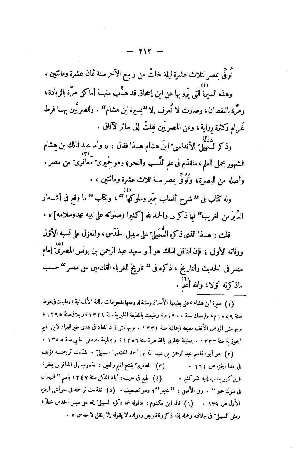 وذكر السّهيلىّ «2» الأندلسىّ ابن هشام هذا فقال: «وأما عبد الملك بن هشام فمشهور بحمل العلم، متقدّم فى علم النّسب والنحو؛ وهو حميرىّ معافرىّ «3» من مصر.