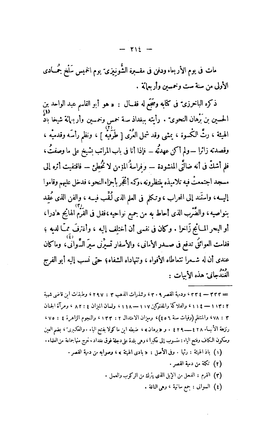 ذكره الباخرزىّ فى كتابه وسجع له فقال: «هو أبو القاسم عبد الواحد بن الحسين بن برهان النحوىّ. رأيته ببغداذ سنة خمس وخمسين وأربعمائة شيخا بادّ «1» الهيئة، رثّ الكسوة، يمشى وقد شمل العرى [طرفيه] «2»، ونظم رأسه وقدميه، وقصدته زائرا- ولم أكن عهدته- فإذا أنا فى باب المراتب بشيخ على ما وصفت، فلم أشكّ فى أنه ضالّتى المنشودة- وفراسة المؤمن لا تخطئ- فاقتفيت أثره إلى مسجد اجتمعت فيه تلاميذه ينتظرونه، وكمه أعجر بأجزاء النحو، فدخل عليهم وقاموا إليه، واستند إلى المحراب، وتكلم فى العلم الذى لقّب فيه، والفن الذى عقد بنواصيه، والضّرب الذى أحاط به من جميع نواحيه، فقل فى القرم «3» الهائج هادرا، أو البحر المائج زاخرا. وكان فى نفسى أن أختلف إليه، وأغترف ممّا لديه؛ فقامت العوائق تدفع فى صدر الأمانى، والأسفار تسيّرنى سير السّوانى «4»، وما كان عندى أن له شعرا تتعاطاه الأفواه، وتتهاداه الشفاه؛ حتى نسب إليه أبو الفرج الغندجانىّ هذه الأبيات: