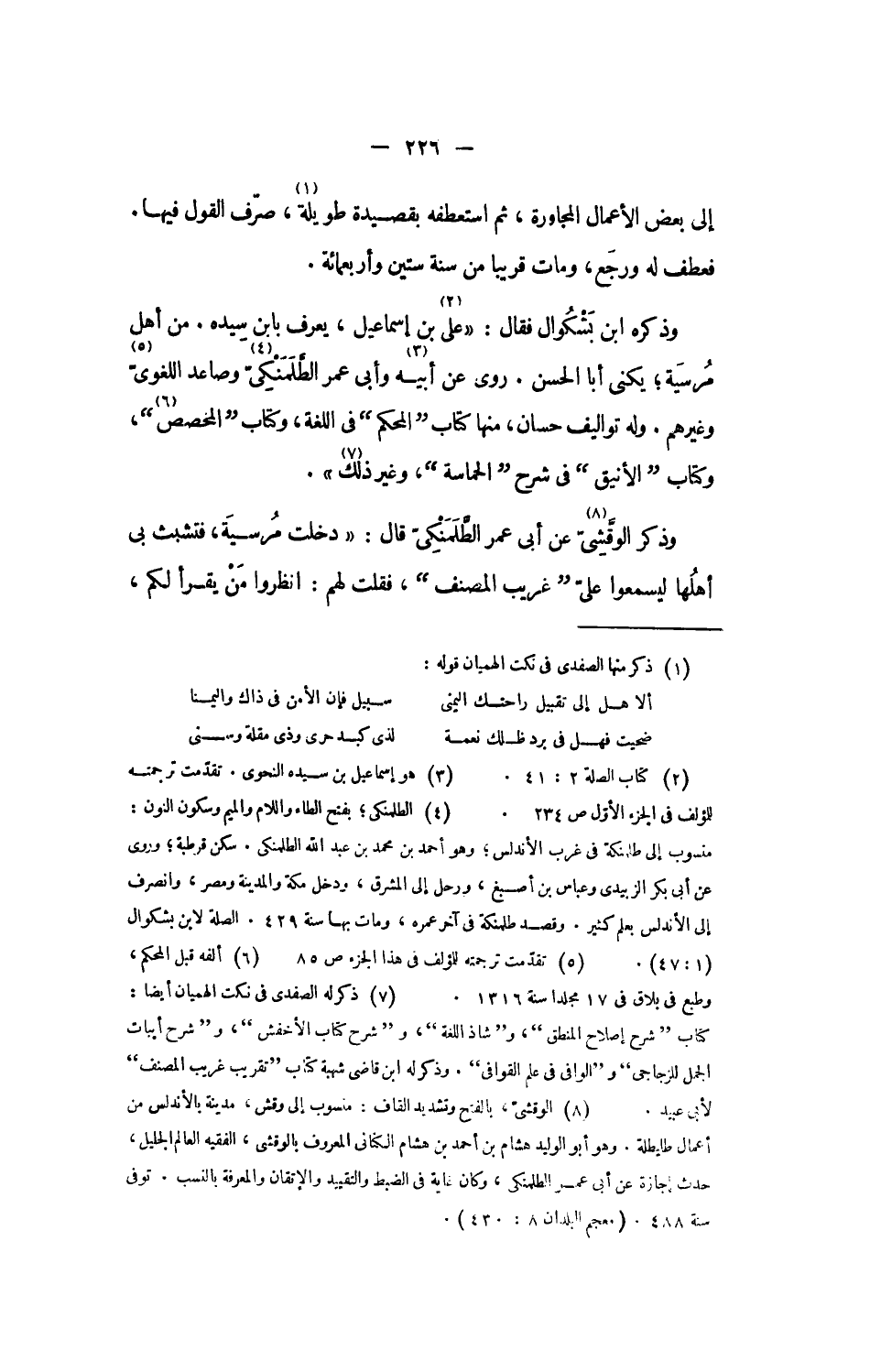 وذكره ابن بشكوال فقال: «على «2» بن إسماعيل، يعرف بابن سيده. من أهل مرسية؛ يكنى أبا الحسن. روى عن أبيه «3» وأبى عمر الطّلمنكىّ «4» وصاعد اللغوىّ «5» وغيرهم. وله تواليف حسان، منها كتاب المحكم فى اللغة، وكتاب المخصص «6»، وكتاب الأنيق فى شرح الحماسة، وغير ذلك «7»».