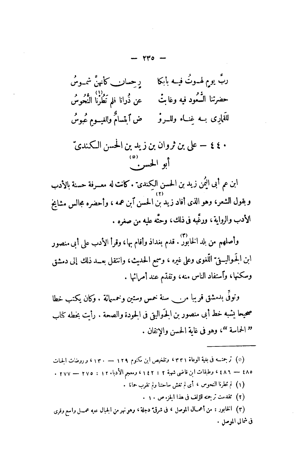 ابن عم أبى اليمن زيد بن الحسن الكندىّ. كانت له معرفة حسنة بالأدب وبقول الشعر، وهو الذى أفاد زيد «2» بن الحسن ابن عمه، وأحضره مجالس مشايخ الأدب والرواية، ورغّبه فى ذلك، وحثّه عليه من صغره.
