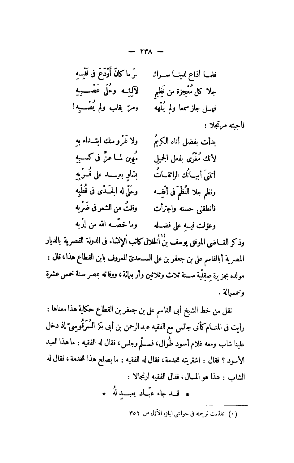 وذكر القاضى الموفق يوسف بن «1» الخلال كاتب الإنشاء فى الدولة القصرية بالديار المصرية أبا القاسم على بن جعفر بن على السعدىّ المعروف بابن القطاع هذا، قال: