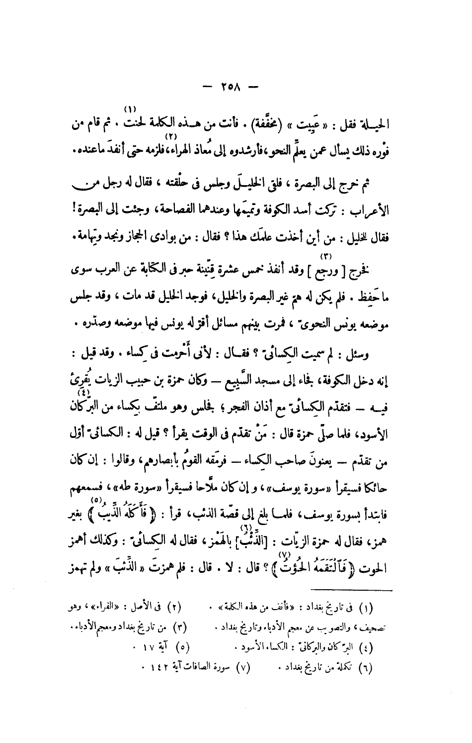 إنه دخل الكوفة، فجاء إلى مسجد السّبيع- وكان حمزة بن حبيب الزيات يقرئ فيه- فتقدّم الكسائىّ مع أذان الفجر؛ فجلس وهو ملتفّ بكساء من البرّكان «4» الأسود، فلما صلّى حمزة قال: من تقدّم فى الوقت يقرأ؟ قيل له: الكسائىّ أوّل من تقدّم- يعنون صاحب الكساء- فرمقه القوم بأبصارهم، وقالوا: إن كان حائكا فسيقرأ «سورة يوسف»، وإن كان ملّاحا فسيقرأ «سورة طه»، فسمعهم فابتدأ بسورة يوسف، فلما بلغ إلى قصّة الذئب، قرأ: (فَأَكَلَهُ الذِّئْبُ)