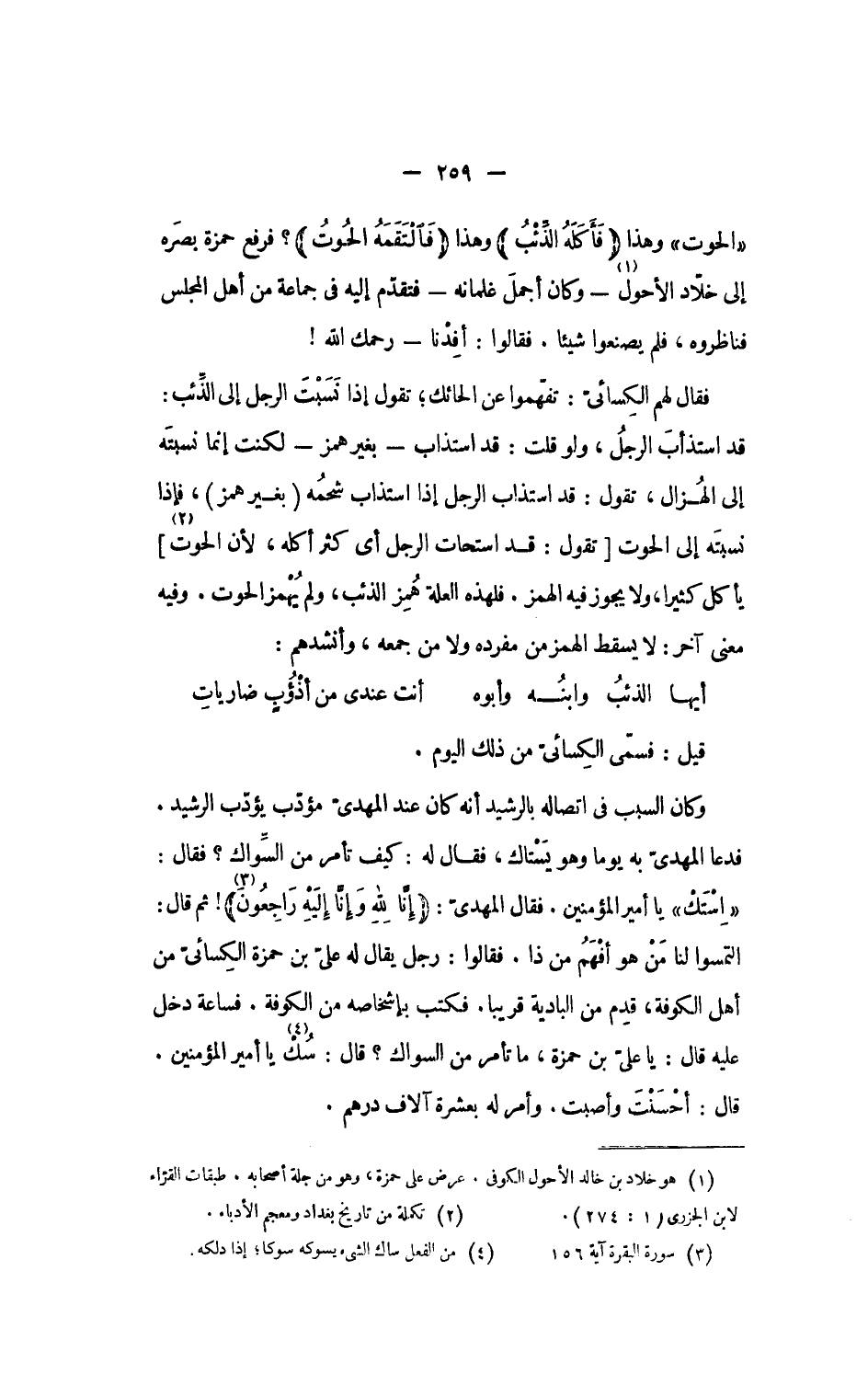 ؟ فرفع حمزة بصره إلى خلّاد الأحول «1» - وكان أجمل غلمانه- فتقدّم إليه فى جماعة من أهل المجلس فناظروه، فلم يصنعوا شيئا. فقالوا: أفدنا- رحمك الله! فقال لهم الكسائىّ: تفهّموا عن الحائك؛ تقول إذا نسبت الرجل إلى الذّئب: