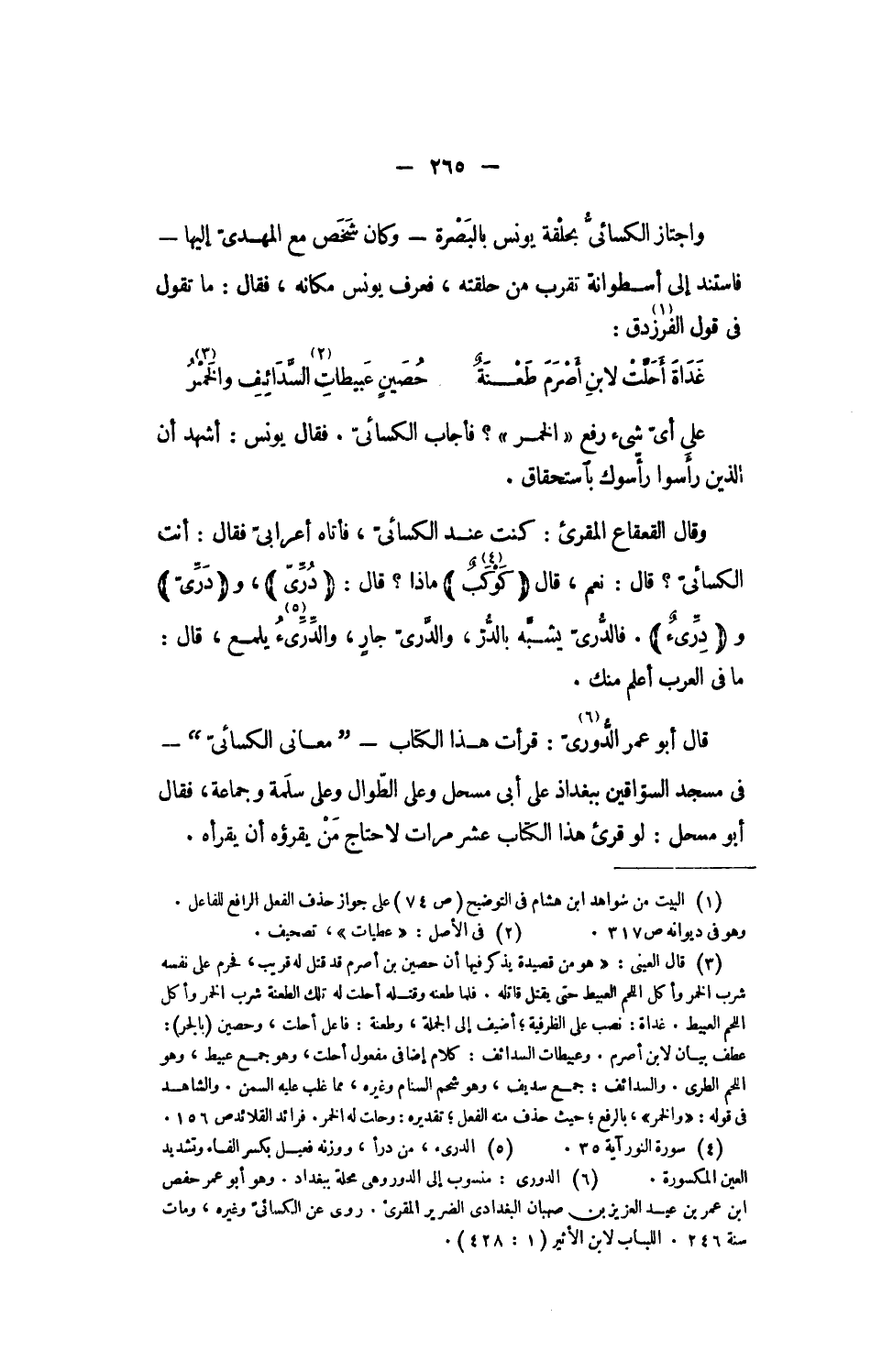 وقال القعقاع المقرئ: كنت عند الكسائىّ، فأتاه أعرابىّ فقال: أنت الكسائىّ؟ قال: نعم، قال (كَوْكَبٌ)